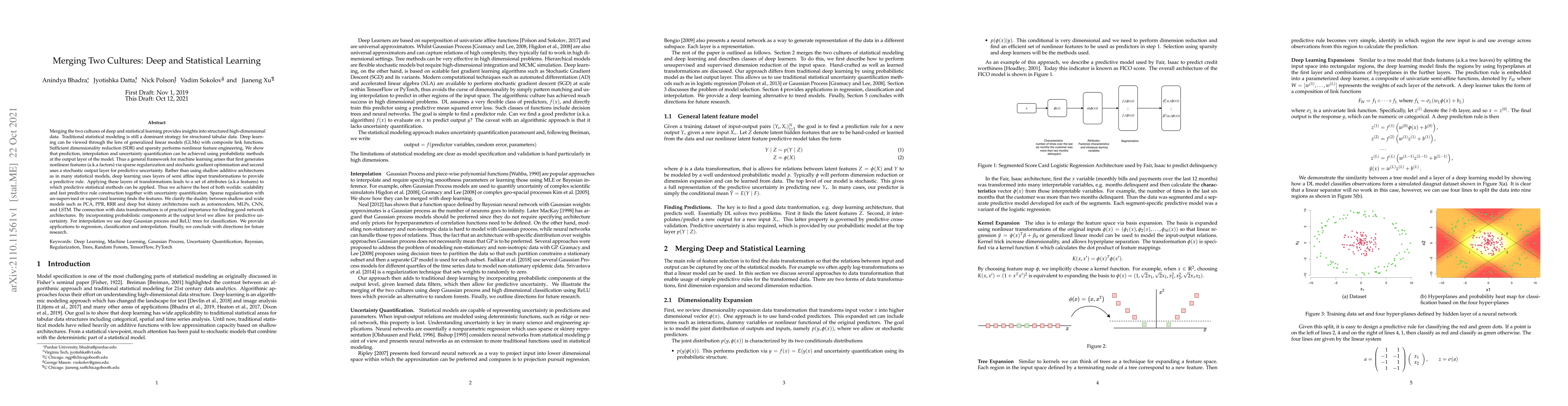 The paper proposes merging deep and statistical learning to analyze structured high-dimensional data, offering a unified machine learning framework. It demonstrates that deep learning can be understood via generalized linear models, and uses sparse regularization and stochastic gradient optimization for nonlinear feature engineering. The methodology employs probabilistic output layers for predictive uncertainty and applies to regression, classification, and interpolation tasks, merging the scalability of deep learning with uncertainty quantification of statistical methods.