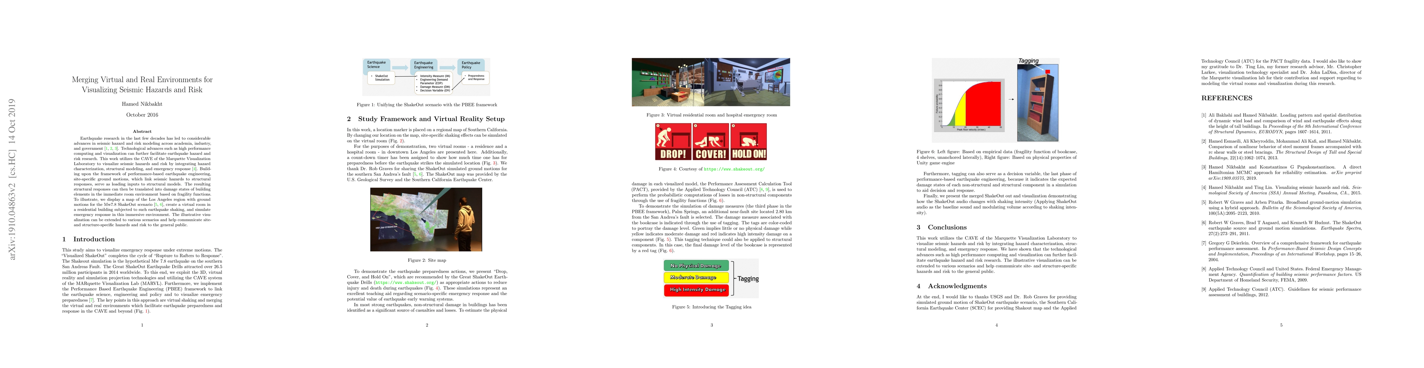 Earthquake research in the last few decades has led to considerable advances in seismic hazard and risk modeling across academia, industry, and government. Technological advances such as high performance computing and visualization can further facilitate earthquake hazard and risk research. This work utilizes the CAVE of the Marquette Visualization Laboratory to visualize seismic hazards and risk by integrating hazard characterization, structural modeling, and emergency response. Building upon the framework of performance-based earthquake engineering, site-specific ground motions, which link seismic hazards to structural responses, serve as loading inputs to structural models. The resulting structural responses can then be translated into damage states of building elements in the immediate room environment based on fragility functions. To illustrate, we display a map of the Los Angeles region with ground motions for the Mw7.8 ShakeOut scenario, create a virtual room in a residential building subjected to such earthquake shaking, and simulate emergency response in this immersive environment. The illustrative visualization can be extended to various scenarios and help communicate site- and structure-specific hazards and risk to the general public.