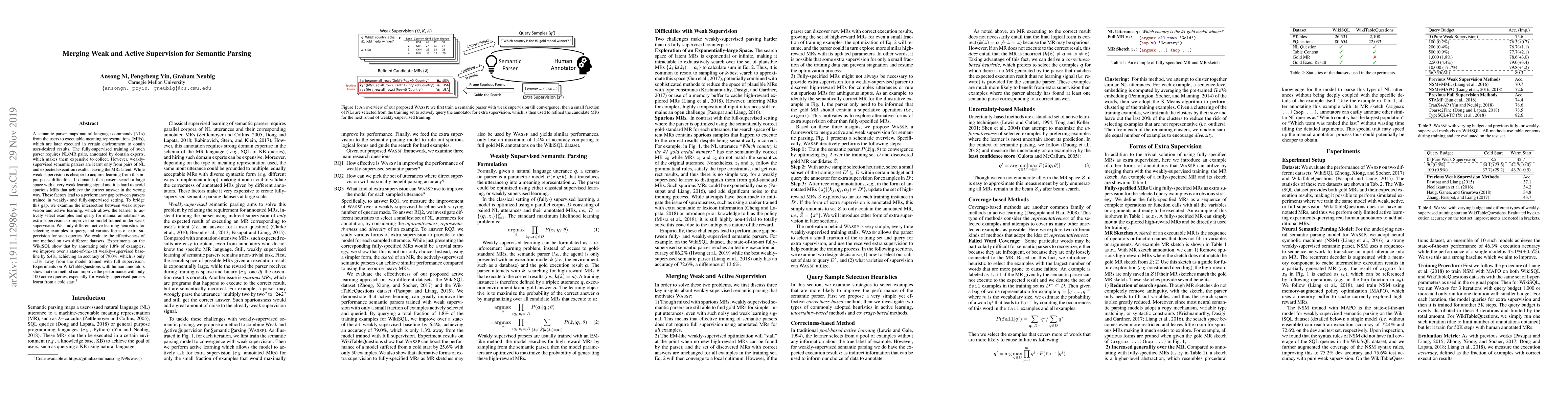 This paper explores merging weak and active supervision to improve semantic parsers, which convert natural language commands into executable meaning representations. By combining weak supervision with active learning, the method can query for manual annotations to bridge the performance gap between weakly- and fully-supervised models, achieving near-full supervision performance with minimal additional annotations.