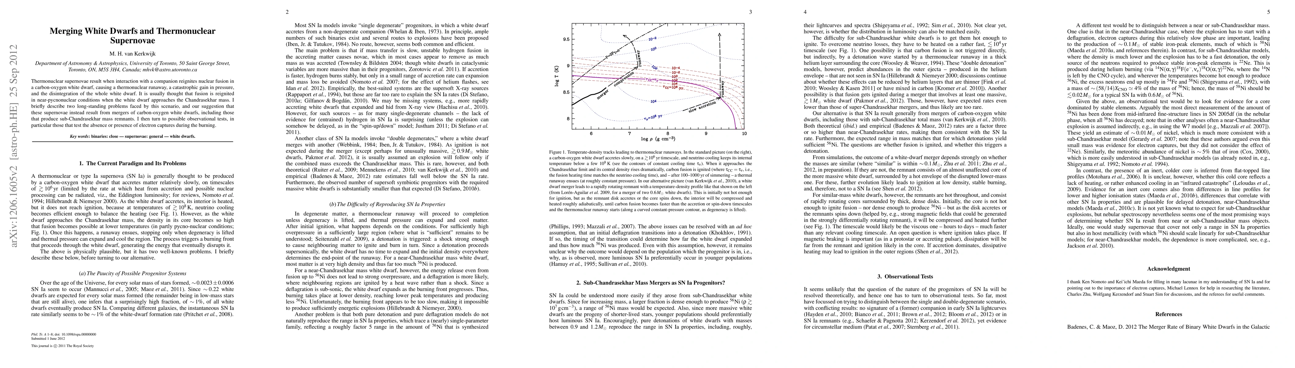 Thermonuclear supernovae result when interaction with a companion reignites nuclear fusion in a carbon-oxygen white dwarf, causing a thermonuclear runaway, a catastrophic gain in pressure, and the disintegration of the whole white dwarf. It is usually thought that fusion is reignited in near-pycnonuclear conditions when the white dwarf approaches the Chandrasekhar mass. I briefly describe two long-standing problems faced by this scenario, and our suggestion that these supernovae instead result from mergers of carbon-oxygen white dwarfs, including those that produce sub-Chandrasekhar mass remnants. I then turn to possible observational tests, in particular those that test the absence or presence of electron captures during the burning.