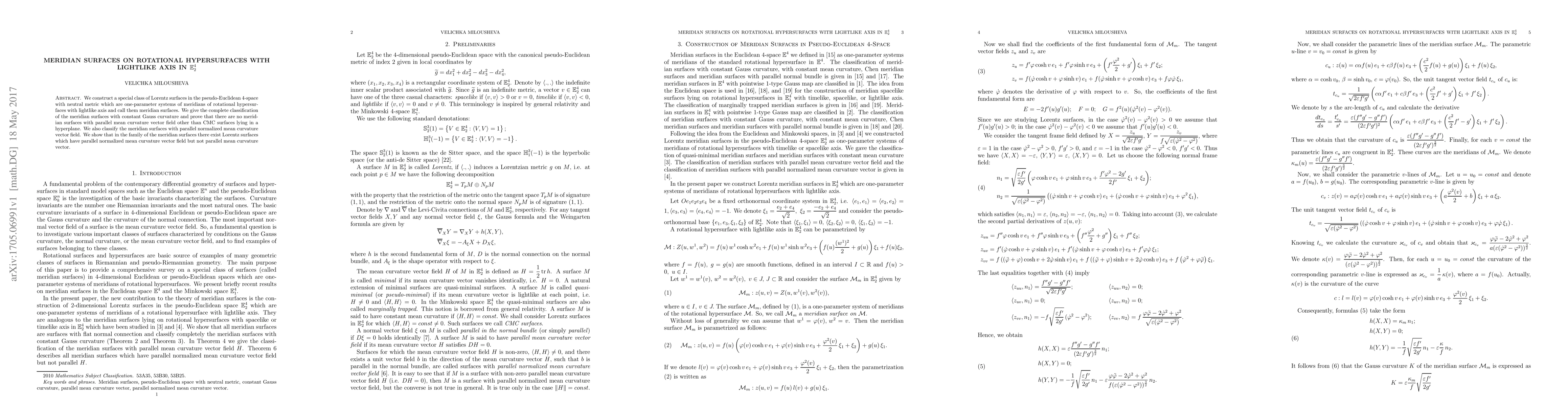 This research contributes to the understanding of Lorentz surfaces and their properties in pseudo-Euclidean spaces, specifically focusing on meridian surfaces, which are essential for studying rotational hypersurfaces with lightlike axes. The findings have implications in differential geometry and the theory of harmonic maps, as well as potential applications in physics.