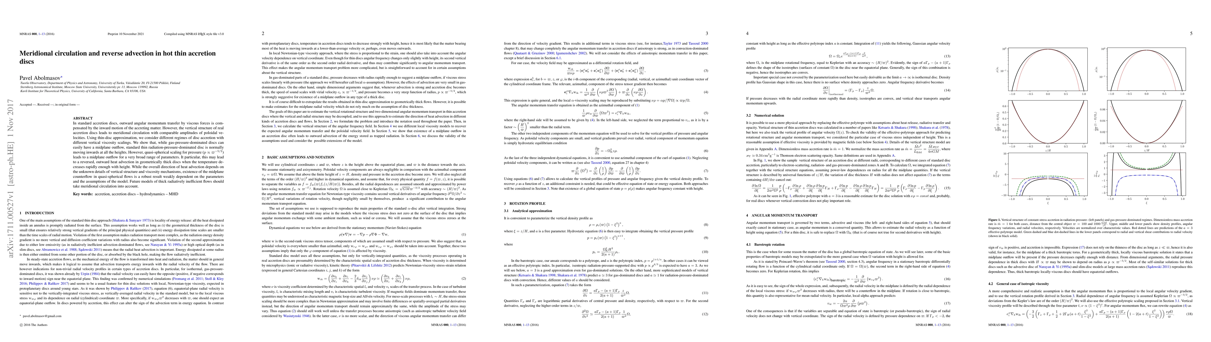 This paper explores meridional circulation in hot thin accretion discs, demonstrating that while gas-pressure-dominated discs can have midplane outflows, radiation-pressure-dominated discs typically move inward. It reveals that a quasi-spherical pressure scaling can induce midplane outflows and potentially reverse heat advection in thick discs, emphasizing the importance of meridional circulation in future models.