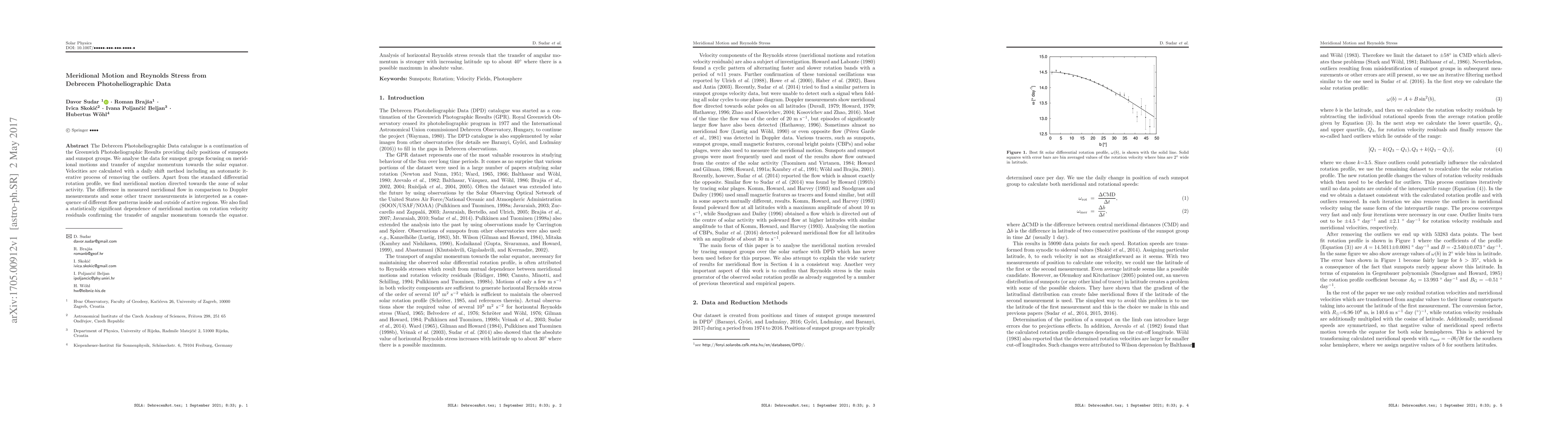 The Debrecen Photoheliographic Data catalogue is a continuation of the Greenwich Photoheliographic Results providing daily positions of sunspots and sunspot groups. We analyse the data for sunspot groups focusing on meridional motions and transfer of angular momentum towards the solar equator. Velocities are calculated with a daily shift method including an automatic iterative process of removing the outliers. Apart from the standard differential rotation profile, we find meridional motion directed towards the zone of solar activity. The difference in measured meridional flow in comparison to Doppler measurements and some other tracer measurements is interpreted as a consequence of different flow patterns inside and outside of active regions. We also find a statistically significant dependence of meridional motion on rotation velocity residuals confirming the transfer of angular momentum towards the equator. Analysis of horizontal Reynolds stress reveals that the transfer of angular momentum is stronger with increasing latitude up to about 40$^{\circ}$ where there is a possible maximum in absolute value.