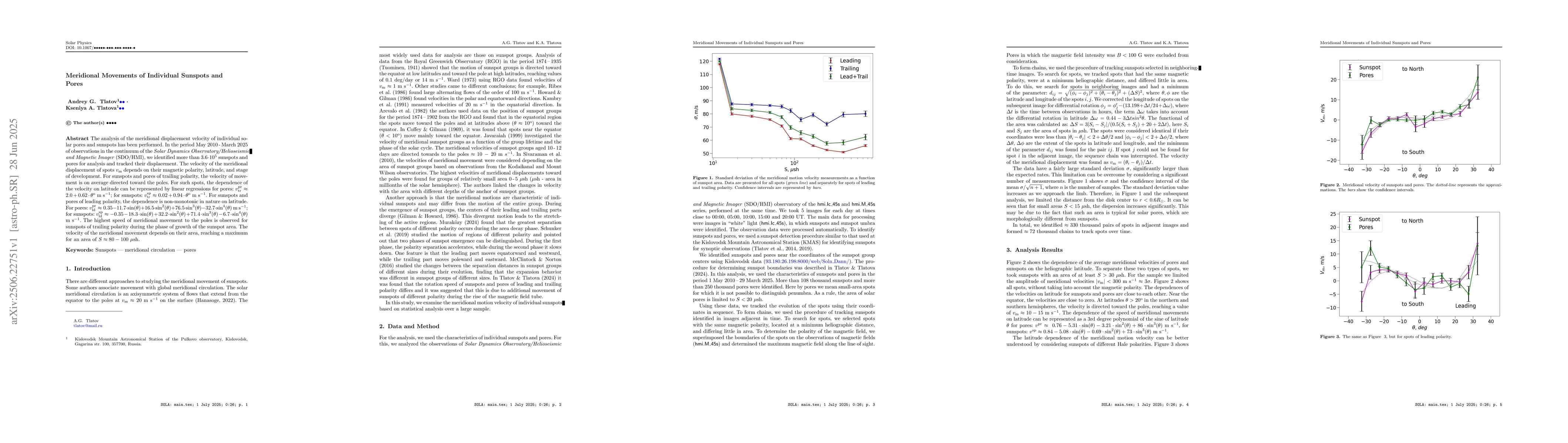 The analysis of the meridional displacement velocity of individual solar pores and sunspots has been performed. In the period May 2010\,-\,March 2025 of observations in the continuum of the \textit{Solar Dynamics Observatory/Helioseismic and Magnetic Imager} (SDO/HMI), we identified more than $3.6\cdot 10^{5}$ sunspots and pores for analysis and tracked their displacement. The velocity of the meridional displacement of spots $v_{\rm m}$ depends on their magnetic polarity, latitude, and stage of development. For sunspots and pores of trailing polarity, the velocity of movement is on average directed toward the poles. For such spots, the dependence of the velocity on latitude can be represented by linear regressions for pores: $v^{\rm pr}_{\rm tr} \approx 2.0+0.62\cdot \theta^{\rm o}$ m s$^{-1}$; for sunspots: $v^{\rm sp}_{\rm tr}\approx 0.02+0.94\cdot \theta ^{\rm o}$ m s$^{-1}$. For sunspots and pores of leading polarity, the dependence is non-monotonic in nature on latitude. For pores: $v^{\rm pr}_{\rm ld}\approx 0.35-11.7\cdot {\rm sin}(\theta)+16.5\cdot {\rm sin}^{\rm 2} (\theta) +76.5\cdot {\rm sin}^3 (\theta)-32.7\cdot {\rm sin}^{4}(\theta )$ m s$^{-1}$; for sunspots: $v^{\rm sp}_{\rm ld}\approx -0.35-18.3\cdot {\rm sin}(\theta)+32.2\cdot {\rm sin}^{\rm 2}(\theta) +71.4\cdot {\rm sin}^{\rm 3} (\theta)-6.7\cdot {\rm sin}^{\rm 4}(\theta)$ m s$^{-1}$. The highest speed of meridional movement to the poles is observed for sunspots of trailing polarity during the phase of growth of the sunspot area. The velocity of the meridional movement depends on their area, reaching a maximum for an area of $S\approx 80 - 100$ $\mu$sh.