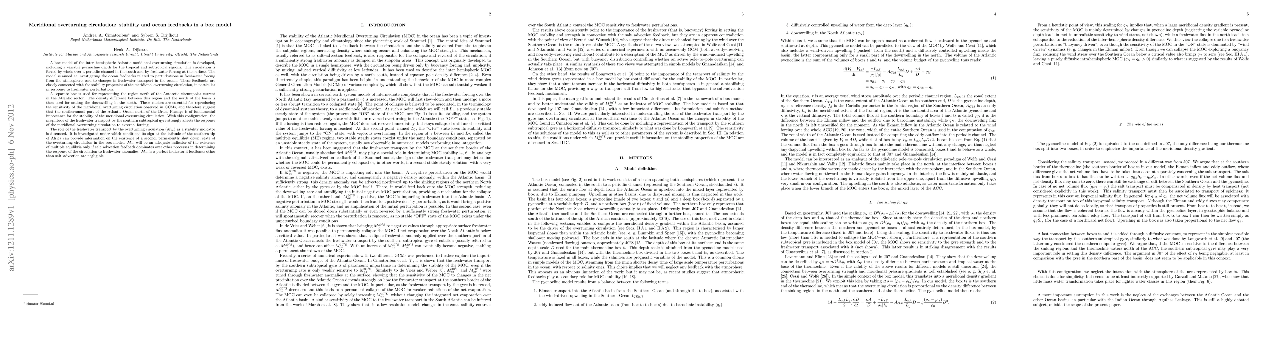 This study develops a box model to investigate the Atlantic meridional overturning circulation, focusing on ocean feedbacks and stability under freshwater perturbations. The model examines the dynamics influenced by wind-driven and freshwater-induced changes, particularly in the tropical and subtropical regions.