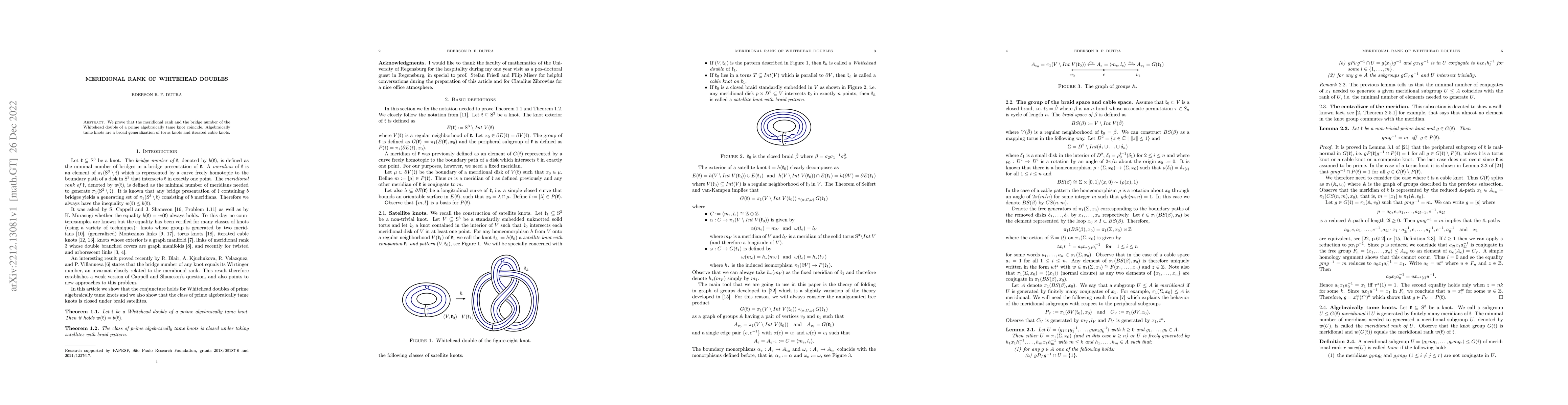 Summary: The paper proves that the meridional rank and the bridge number of the Whitehead double of an algebraically tame knot are equal, extending the properties of these knots, which generalize torus and iterated cable knots. This finding provides deeper insight into the structural characteristics of these knots.
