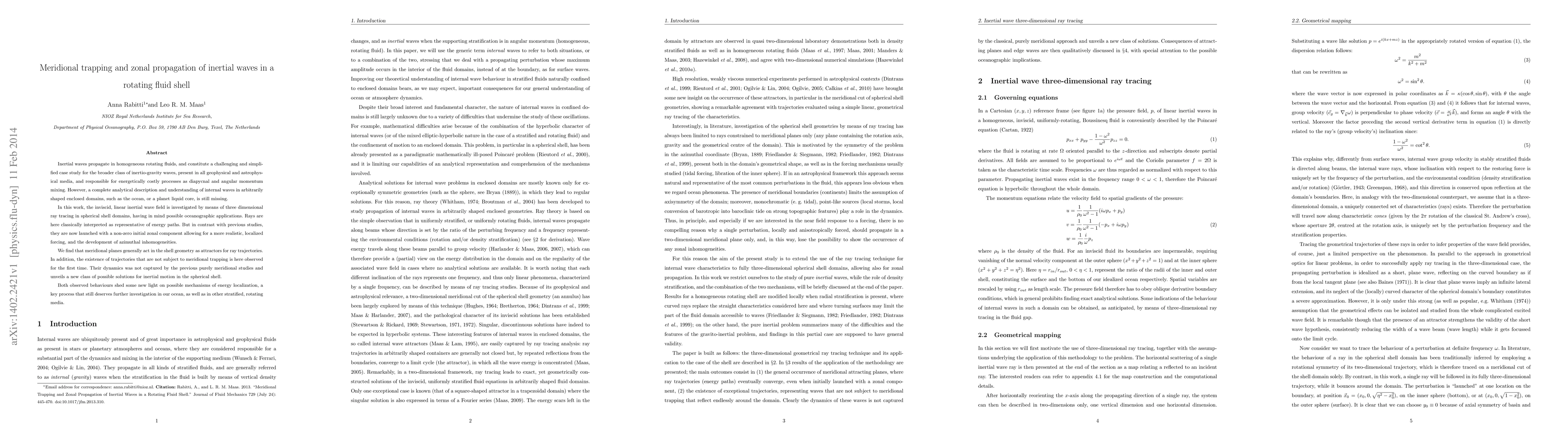 This paper investigates the propagation of inertial waves in a rotating fluid shell using three-dimensional ray tracing, revealing meridional trapping and zonal propagation dynamics. It identifies a new class of inertial wave trajectories not captured by previous studies, offering insights into energy localization mechanisms in rotating, stratified fluids.