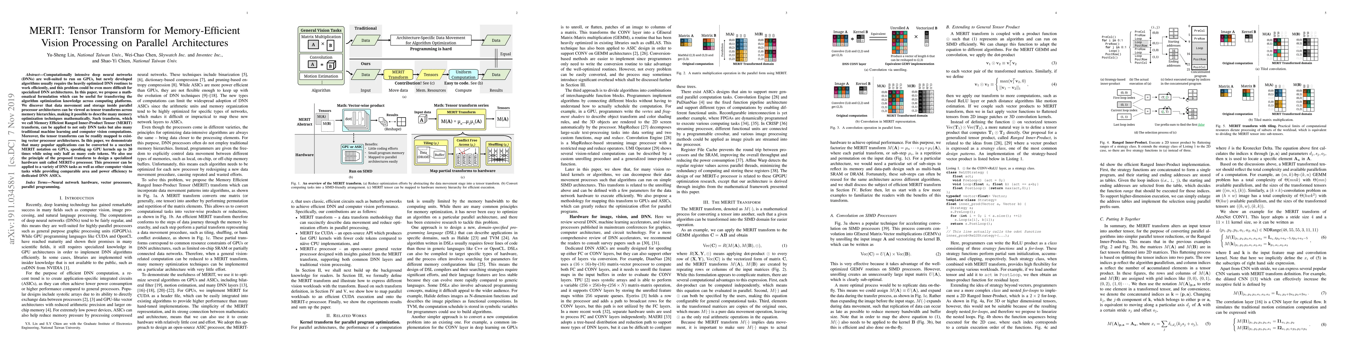This paper proposes the MERIT transform, a mathematical formulation for memory-efficient tensor transforms that optimizes data movement and storage in parallel architectures. The MERIT transform speeds up GPU kernels by up to 20 times and enables the design of a specialized MERIT-z processor for efficient DNN and computer vision tasks.