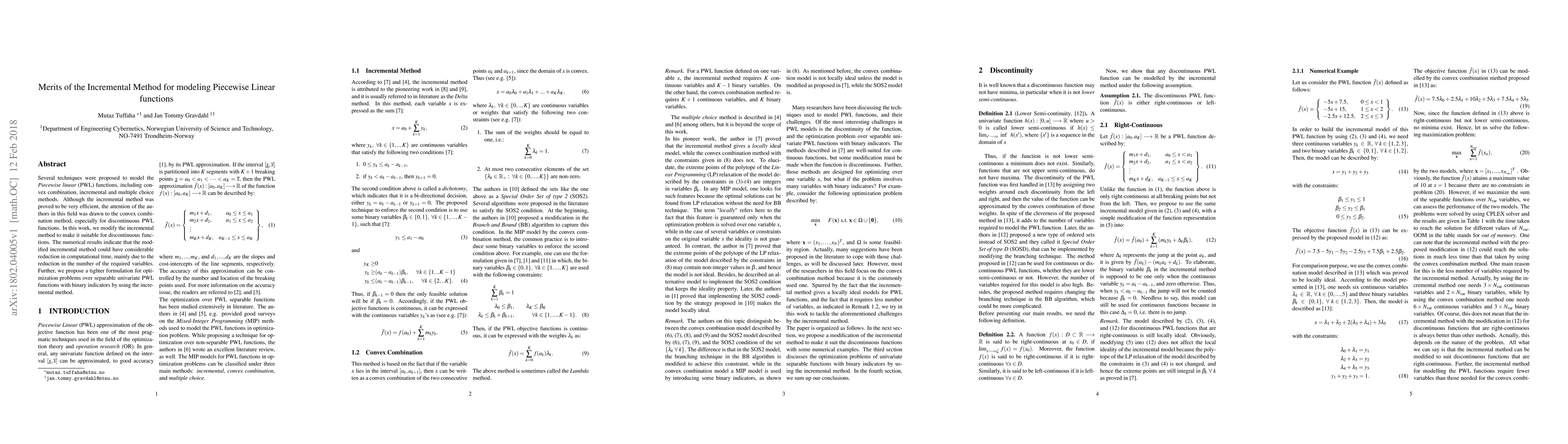Several techniques were proposed to model the Piecewise linear (PWL) functions, including convex combination, incremental and multiple choice methods. Although the incremental method was proved to be very efficient, the attention of the authors in this field was drawn to the convex combination method, especially for discontinuous PWL functions. In this work, we modify the incremental method to make it suitable for discontinuous functions. The numerical results indicate that the modified incremental method could have considerable reduction in computational time, mainly due to the reduction in the number of the required variables. Further, we propose a tighter formulation for optimization problems over separable univariate PWL functions with binary indicators by using the incremental method.