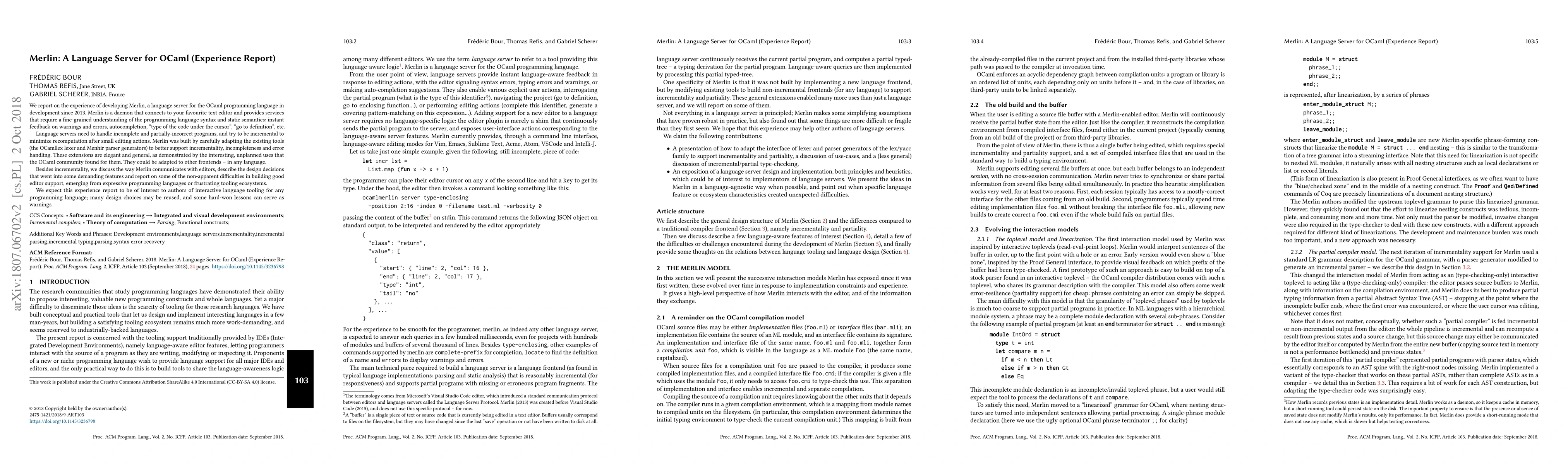 Merlin is a language server for OCaml that provides real-time feedback, autocompletion, and navigation features by leveraging incremental parsing and handling of incomplete code. The experience report highlights design choices and challenges in building robust editor support for expressive programming languages.