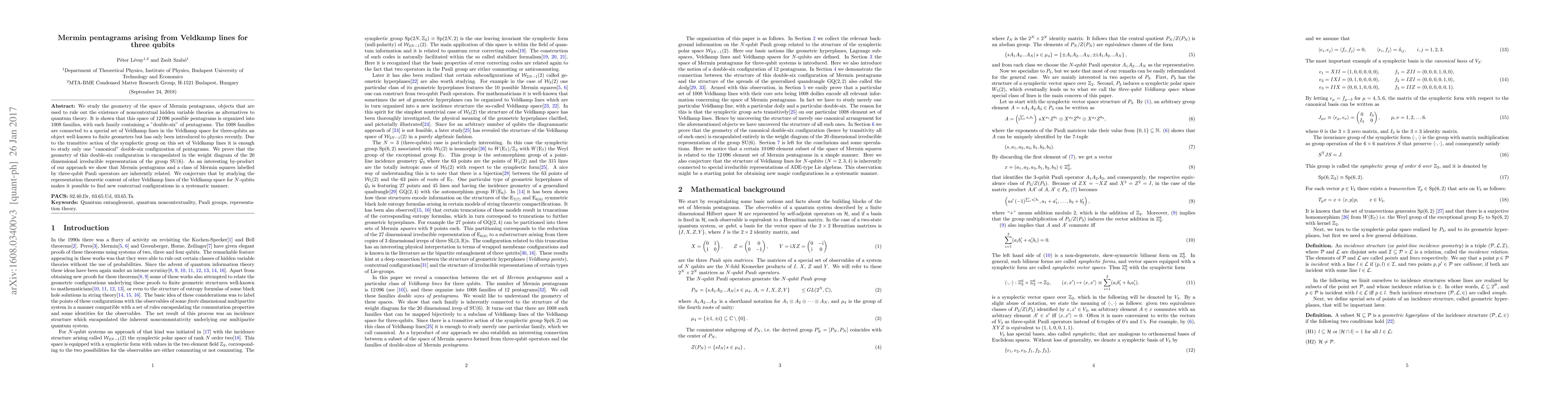 This paper explores the geometric organization of Mermin pentagrams, which disprove noncontextual hidden variable theories, revealing 1008 families linked to Veldkamp lines in three-qubit systems. The study simplifies analysis through the symplectic group's action on these lines, showing a connection to the $SU(6)$ group's 20-dimensional representation.