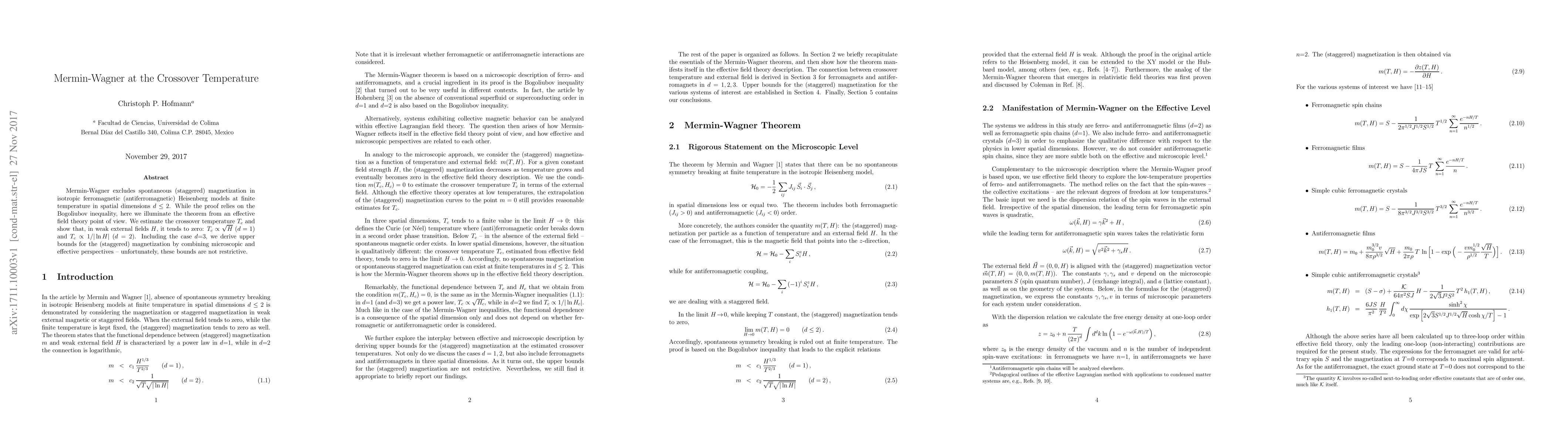 Mermin-Wagner excludes spontaneous (staggered) magnetization in isotropic ferromagnetic (antiferromagnetic) Heisenberg models at finite temperature in spatial dimensions $d \le 2$. While the proof relies on the Bogoliubov inequality, here we illuminate the theorem from an effective field theory point of view. We estimate the crossover temperature $T_c$ and show that, in weak external fields $H$, it tends to zero: $T_c \propto \sqrt{H}$ ($d=1$) and $T_c \propto 1/|\ln H|$ ($d=2$). Including the case $d$=3, we derive upper bounds for the (staggered) magnetization by combining microscopic and effective perspectives -- unfortunately, these bounds are not restrictive.