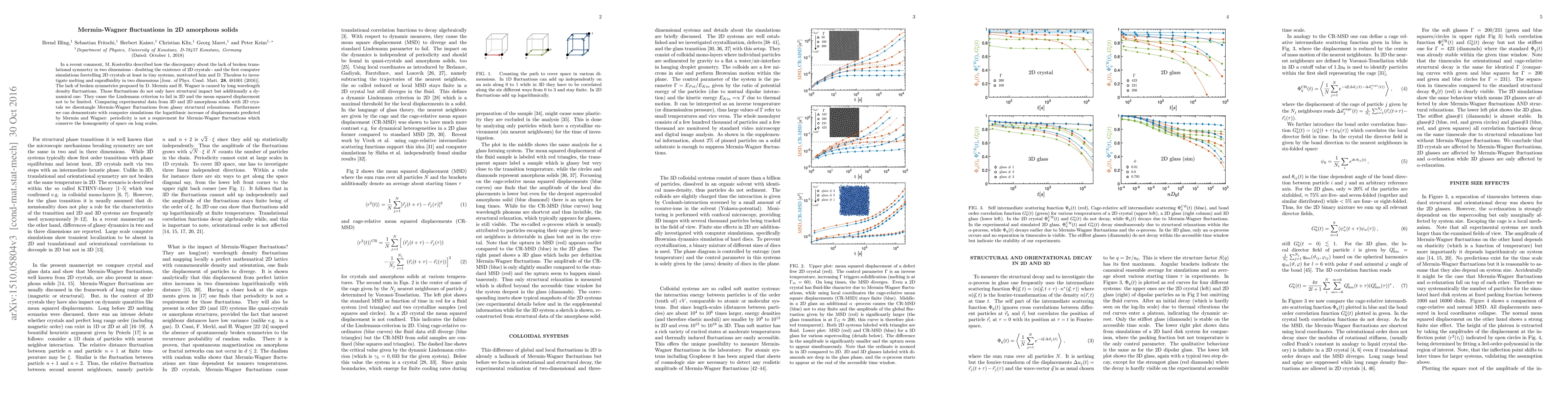 In a recent comment, M. Kosterlitz described how the discrepancy about the lack of broken translational symmetry in two dimensions - doubting the existence of 2D crystals - and the first computer simulations foretelling 2D crystals at least in tiny systems, motivated him and D. Thouless to investigate melting and suprafluidity in two dimensions [Jour. of Phys. Cond. Matt. \textbf{28}, 481001 (2016)]. The lack of broken symmetries proposed by D. Mermin and H. Wagner is caused by long wavelength density fluctuations. Those fluctuations do not only have structural impact but additionally a dynamical one: They cause the Lindemann criterion to fail in 2D and the mean squared displacement not to be limited. Comparing experimental data from 3D and 2D amorphous solids with 2D crystals we disentangle Mermin-Wagner fluctuations from glassy structural relaxations. Furthermore we can demonstrate with computer simulations the logarithmic increase of displacements predicted by Mermin and Wagner: periodicity is not a requirement for Mermin-Wagner fluctuations which conserve the homogeneity of space on long scales.
