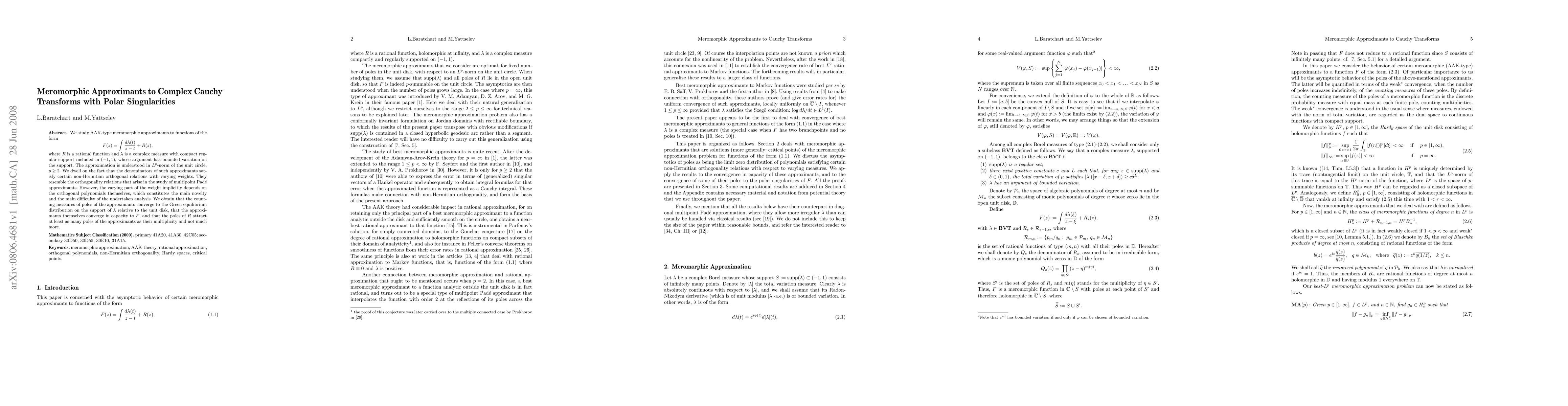 This paper investigates AAK-type meromorphic approximants for functions composed of a rational function and a Cauchy transform of a complex measure, showing that the poles of these approximants converge to the Green equilibrium distribution and that the approximants converge to the function in capacity.