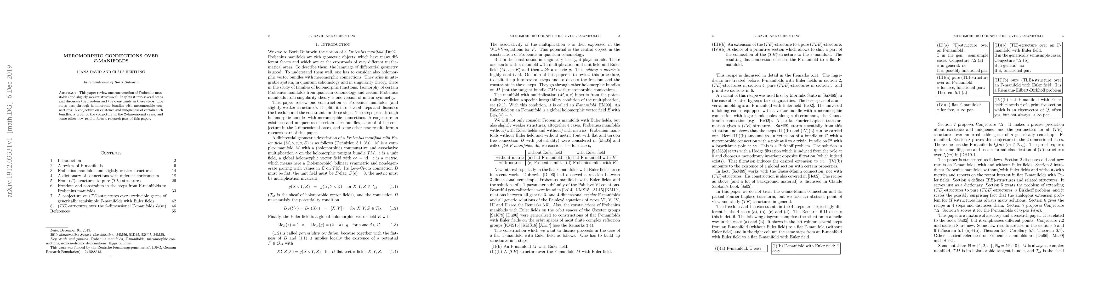 This paper review one construction of Frobenius manifolds (and slightly weaker structures). It splits it into several steps and discusses the freedom and the constraints in these steps. The steps pass through holomorphic bundles with meromorphic connections. A conjecture on existence and uniqueness of certain such bundles, a proof of the conjecture in the 2-dimensional cases, and some other new results form a research part of this paper.