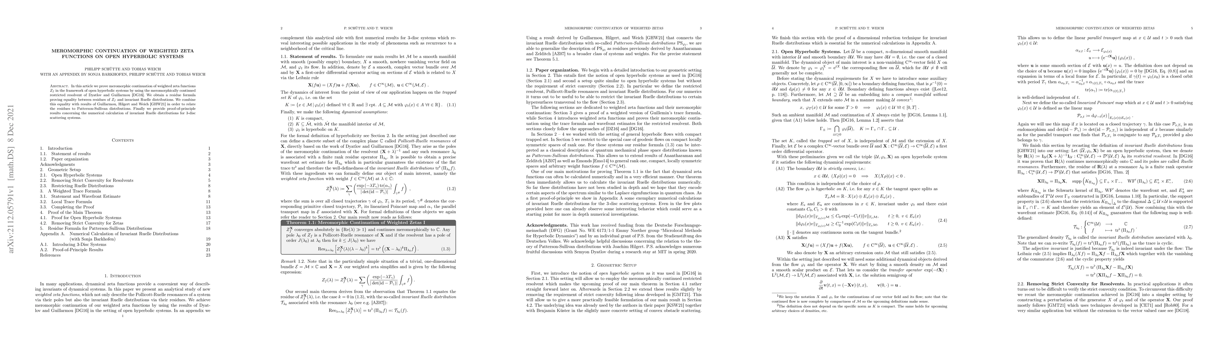 In this article we prove meromorphic continuation of weighted zeta functions in the framework of open hyperbolic systems by using the meromorphically continued restricted resolvent of Dyatlov and Guillarmou (2016). We obtain a residue formula proving equality between residues of weighted zetas and invariant Ruelle distributions. We combine this equality with results of Guillarmou, Hilgert and Weich (2021) in order to relate the residues to Patterson-Sullivan distributions. Finally we provide proof-of-principle results concerning the numerical calculation of invariant Ruelle distributions for 3-disc scattering systems.