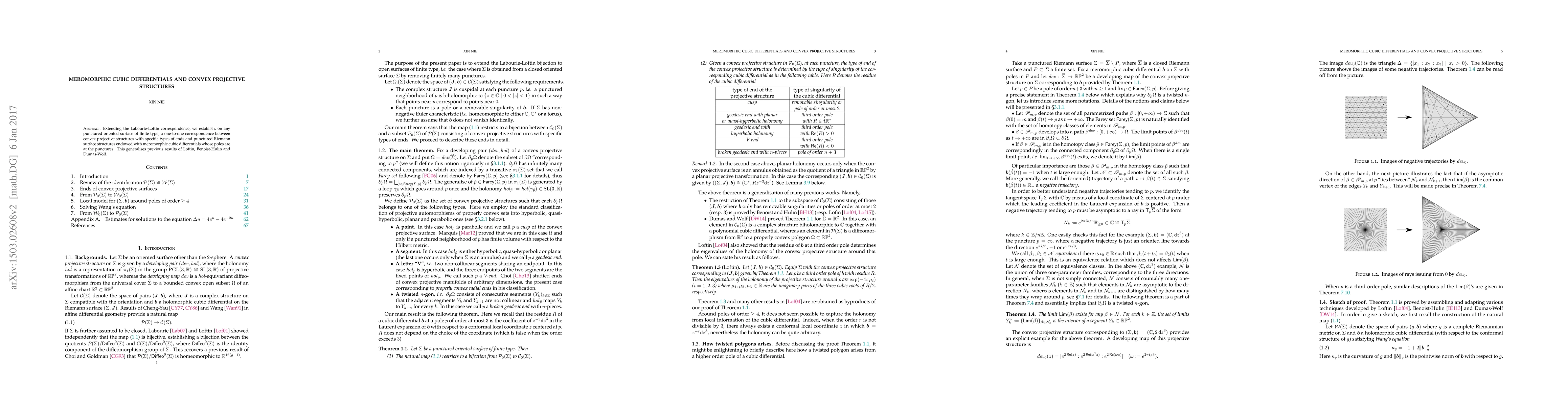 Extending the Labourie-Loftin correspondence, we establish, on any punctured oriented surface of finite type, a one-to-one correspondence between convex projective structures with specific types of ends and punctured Riemann surface structures endowed with meromorphic cubic differentials whose poles are at the punctures. This generalizes previous results of Loftin, Benoist-Hulin and Dumas-Wolf.