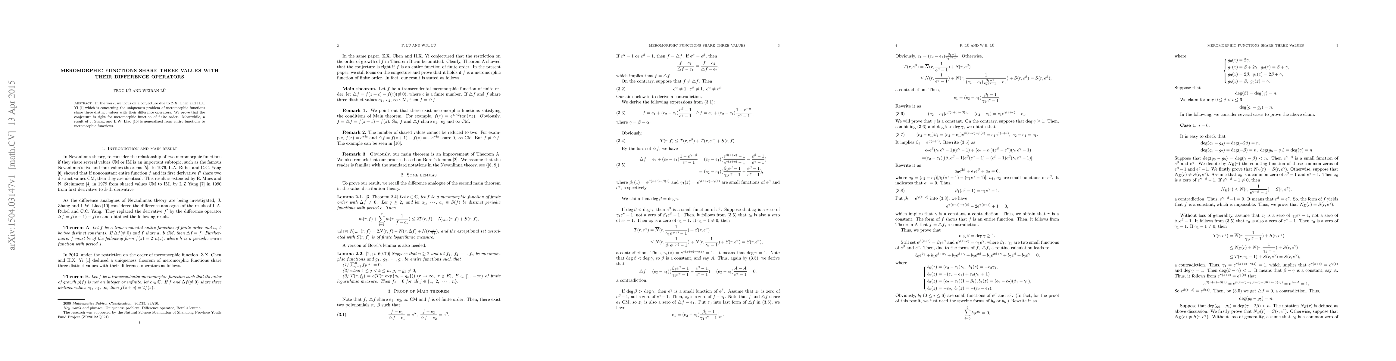 This paper proves the conjecture by Z.X. Chen and H.X. Yi regarding the uniqueness of meromorphic functions sharing three distinct values with their difference operators, specifically for functions of finite order. Additionally, it generalizes a result from entire functions to meromorphic functions.