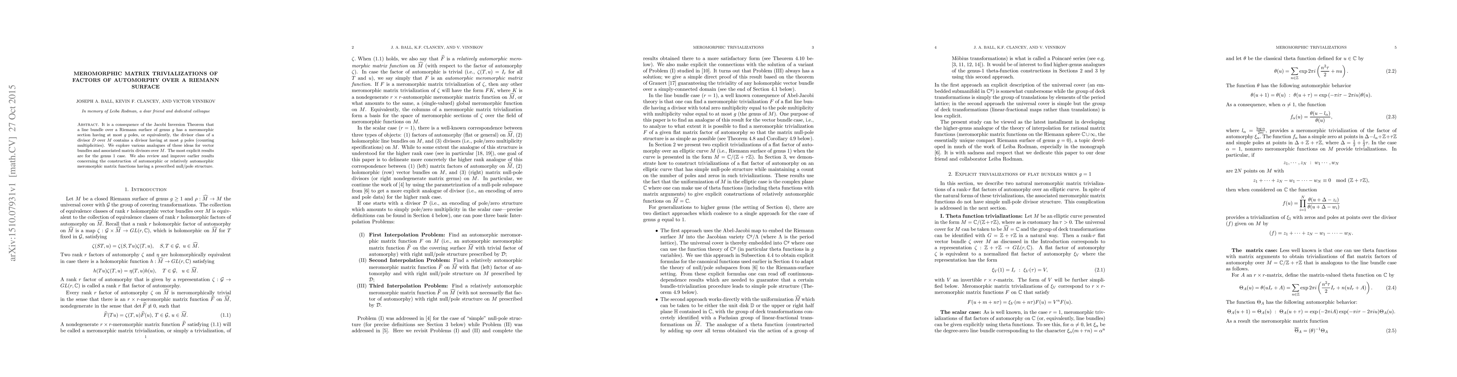 It is a consequence of the Jacobi Inversion Theorem that a line bundle over a Riemann surface M of genus g has a meromorphic section having at most g poles, or equivalently, the divisor class of a divisor D over M contains a divisor having at most g poles (counting multiplicities). We explore various analogues of these ideas for vector bundles and associated matrix divisors over M. The most explicit results are for the genus 1 case. We also review and improve earlier results concerning the construction of automorphic or relatively automorphic meromorphic matrix functions having a prescribed null/pole structure.