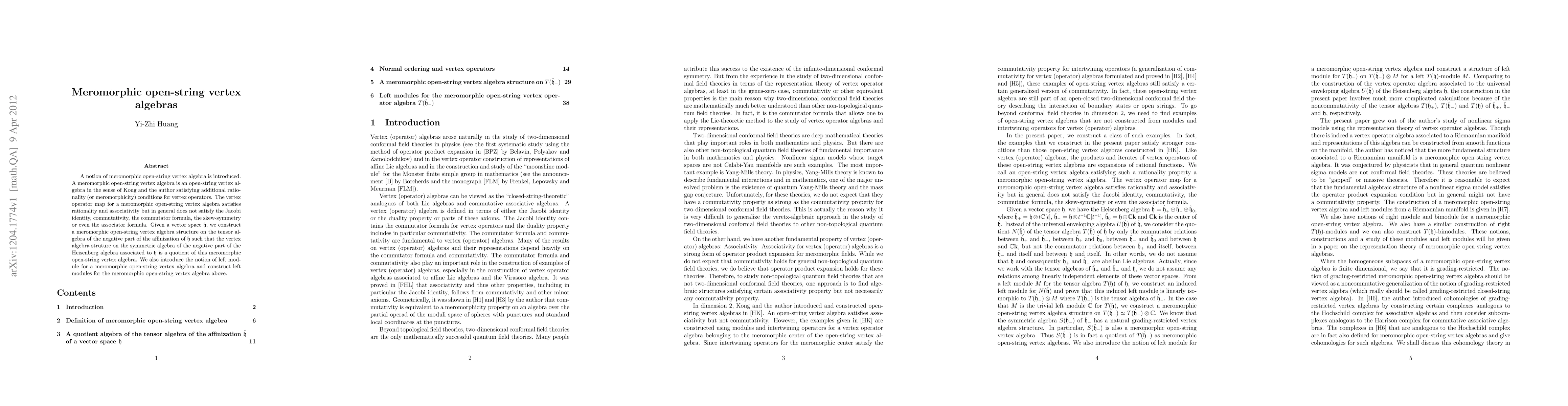 The paper introduces meromorphic open-string vertex algebras, defined as open-string vertex algebras satisfying additional rationality conditions for vertex operators. It constructs a meromorphic open-string vertex algebra structure on the tensor algebra of the negative part of the affinization of a vector space \mathfrak{h} and introduces the notion of left modules for such vertex algebras.