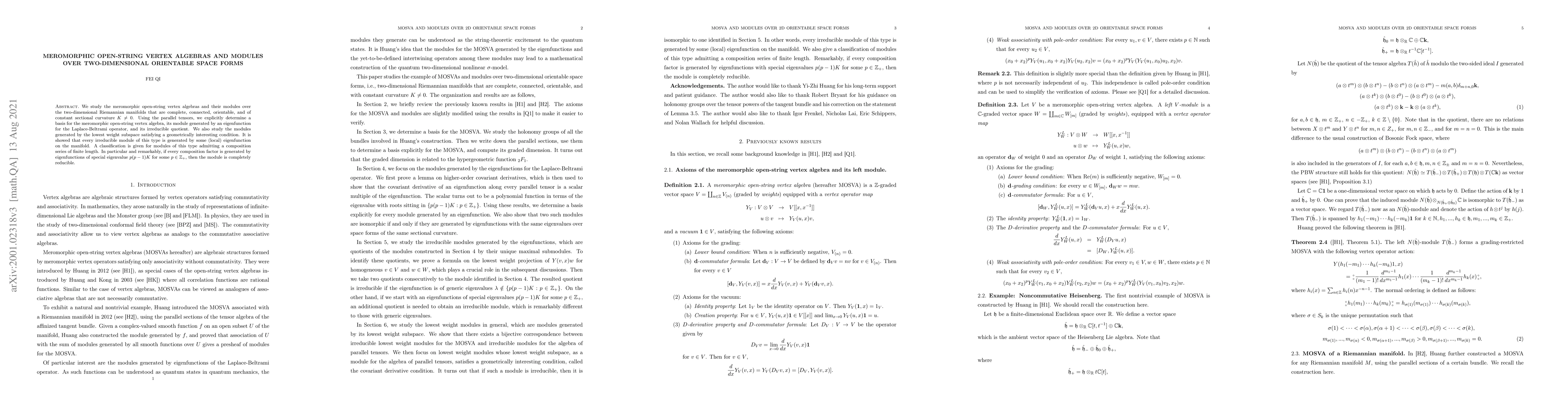 We study the meromorphic open-string vertex algebras and their modules over the two-dimensional Riemannian manifolds that are complete, connected, orientable, and of constant sectional curvature $K\neq 0$. Using the parallel tensors, we explicitly determine a basis for the meromorphic open-string vertex algebra, its modules generated by eigenfunctions of the Laplace-Beltrami operator, and their irreducible quotients. We also study the modules generated by lowest weight subspace satisfying a geometrically interesting condition. It is showed that every irreducible module of this type is generated by some (local) eigenfunction on the manifold. A classification is given for modules of this type admitting a composition series of finite length. In particular and remarkably, if every composition factor is generated by eigenfunctions of eigenvalue $p(p-1)K$ for some $p\in \mathbb{Z}_+$, then the module is completely reducible.