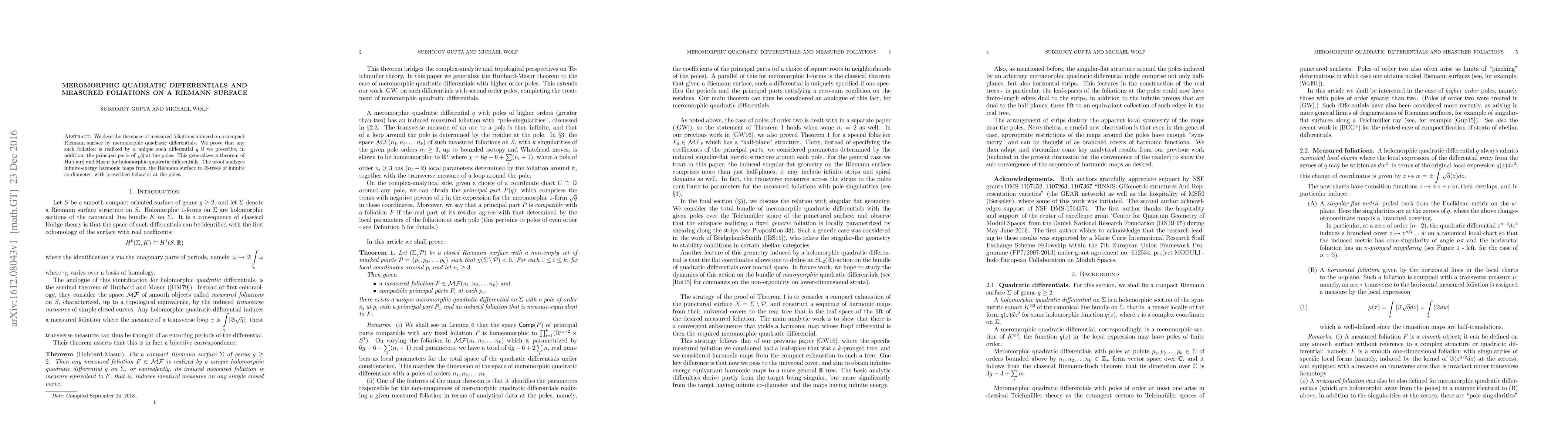 Summary: The paper explores the relationship between meromorphic quadratic differentials and measured foliations on Riemann surfaces, proving that any such foliation corresponds uniquely to a differential given specific principal parts at poles, extending a previous result for holomorphic cases. The proof involves analyzing harmonic maps to infinite co-diameter R-trees.