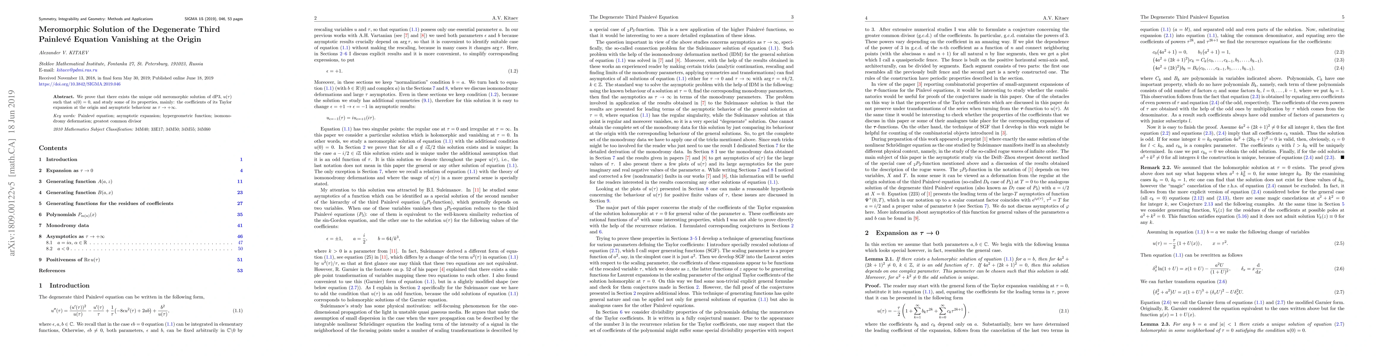 We prove that there exists the unique odd meromorphic solution of dP3, $u(\tau)$ such that $u(0)=0$, and study some of its properties, mainly: the coefficients of its Taylor expansion at the origin and asymptotic behaviour as $\tau\to+\infty$.
