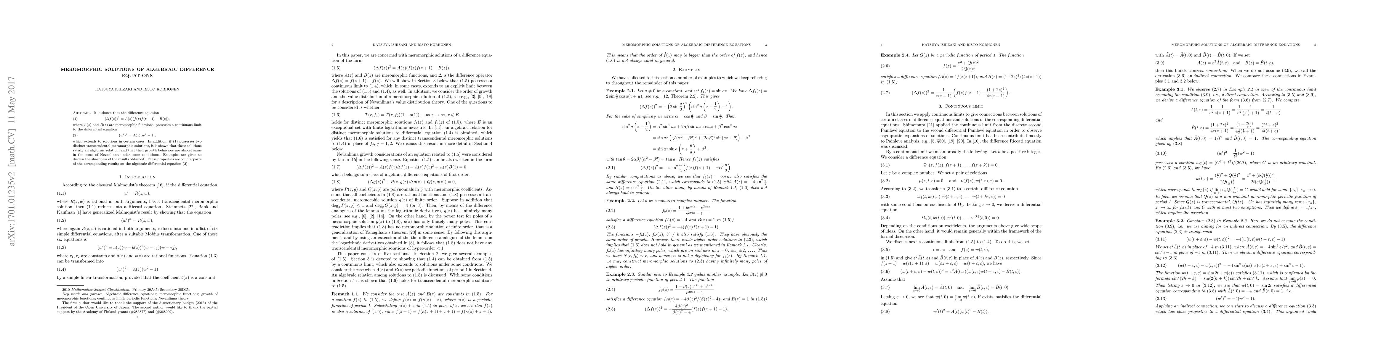 The paper investigates meromorphic solutions of the algebraic difference equation (1) and demonstrates its continuous limit to the differential equation (2). It shows that if (1) has two distinct transcendental meromorphic solutions, they satisfy an algebraic relation and exhibit similar growth behaviors under certain conditions.