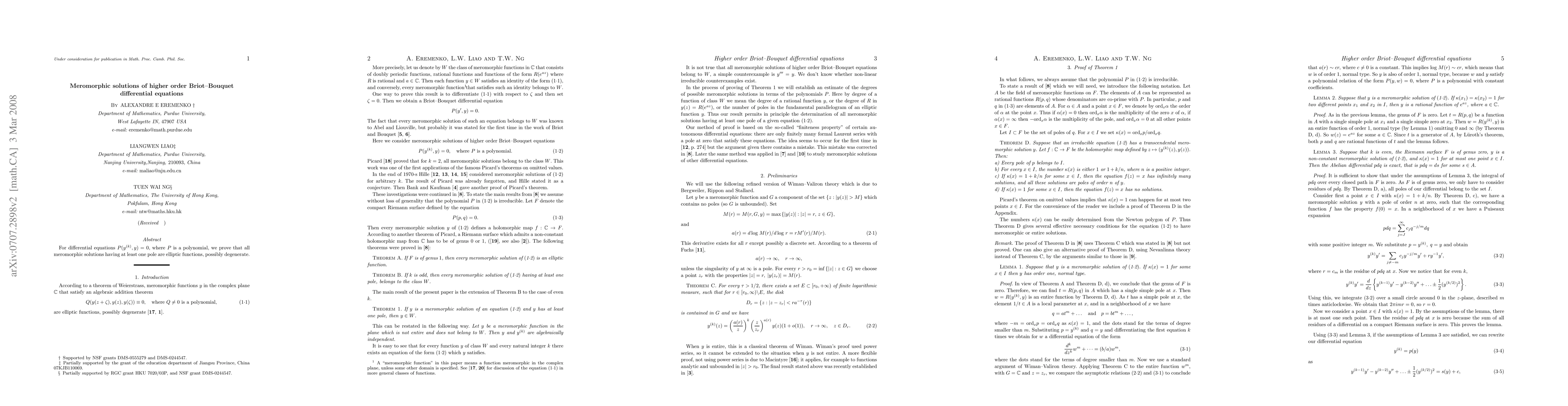 For differential equations $P(y^{(k)},y)=0,$ where $P$ is a polynomial, we prove that all meromorphic solutions having at least one pole are elliptic functions, possibly degenerate.