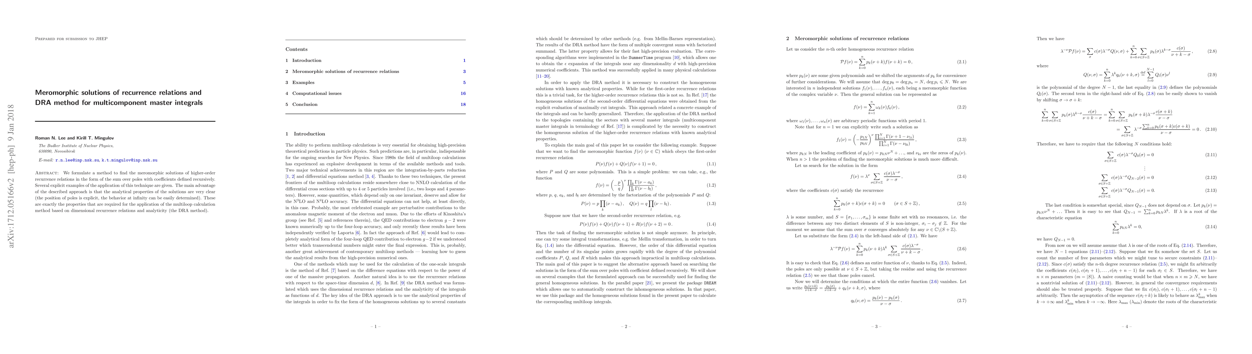 This paper introduces a method for finding meromorphic solutions of higher-order recurrence relations, expressed as sums over poles with recursively defined coefficients. The technique's main advantage is its clear analytical properties, facilitating the application of the DRA method for multiloop calculations.