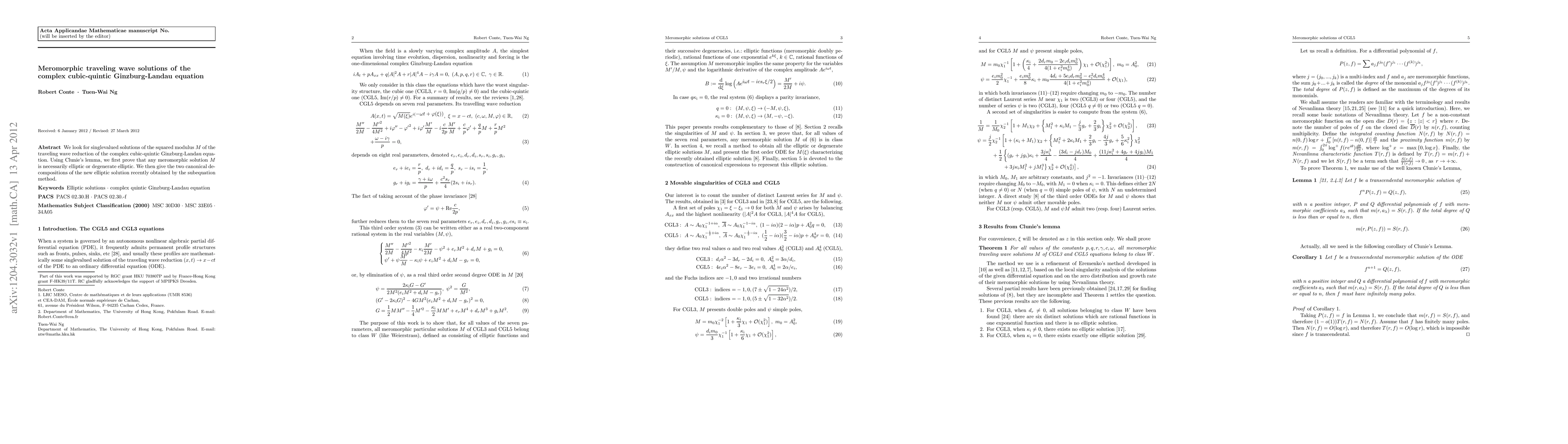 We look for singlevalued solutions of the squared modulus M of the traveling wave reduction of the complex cubic-quintic Ginzburg-Landau equation. Using Clunie's lemma, we first prove that any meromorphic solution M is necessarily elliptic or degenerate elliptic. We then give the two canonical decompositions of the new elliptic solution recently obtained by the subequation method.