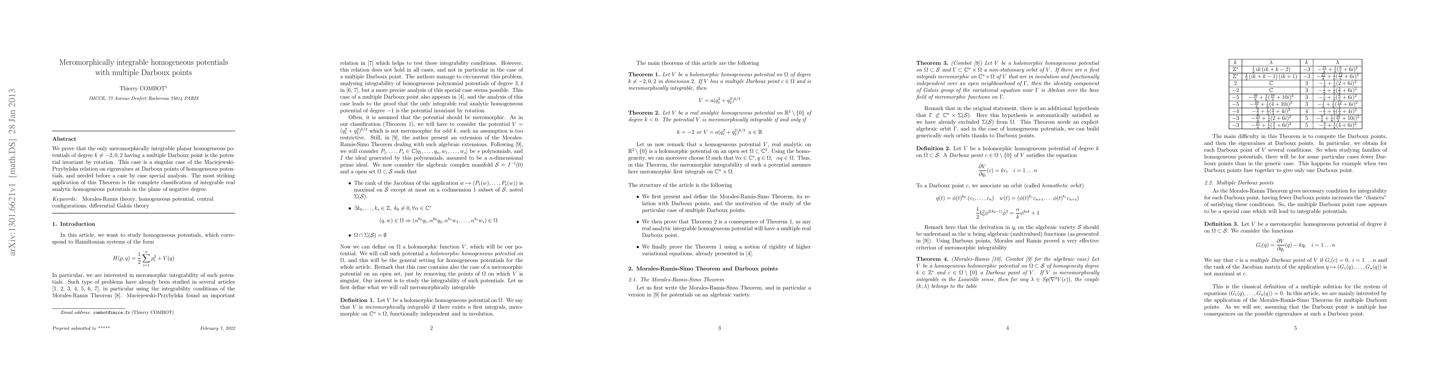 This paper proves that only rotationally invariant planar homogeneous potentials of degree k ≠ -2, 0, 2 can have multiple Darboux points, providing a complete classification of integrable real analytic homogeneous potentials in the plane of negative degree. This result is crucial for the Maciejewski-Przybylska relation on eigenvalues at Darboux points.