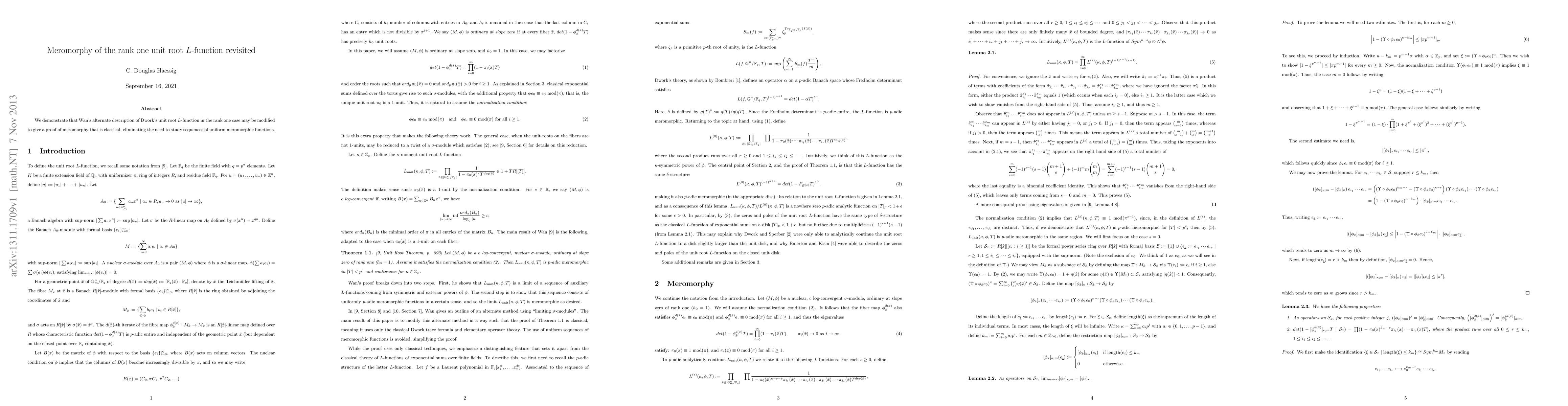 We demonstrate that Wan's alternate description of Dwork's unit root L-function in the rank one case may be modified to give a proof of meromorphy that is classical, eliminating the need to study sequences of uniform meromorphic functions.