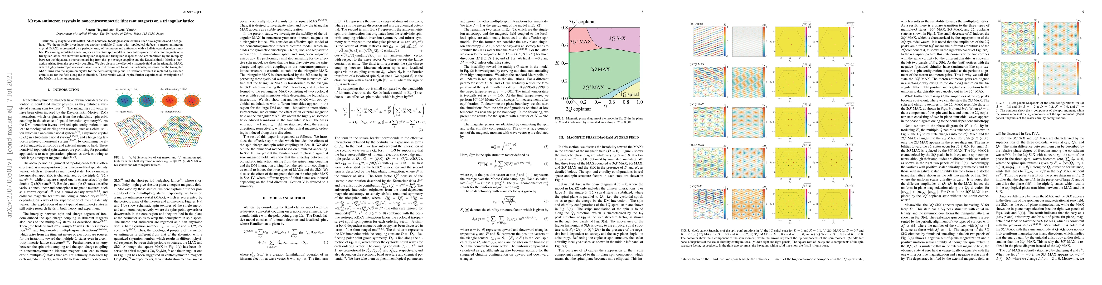 This paper investigates the stabilization of meron-antimeron crystals (MAXs) in noncentrosymmetric itinerant magnets on a triangular lattice, showing that MAXs arise from the interplay of biquadratic and Dzyaloshinskii-Moriya interactions. The study reveals distinct magnetic field responses, transforming the MAX into skyrmion or chiral states depending on the field direction.