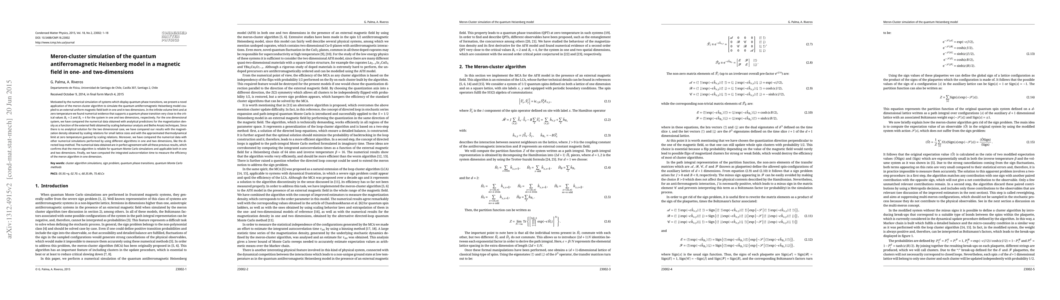 This paper applies the meron-cluster algorithm to simulate the quantum antiferromagnetic Heisenberg model in one and two dimensions under an external magnetic field, finding numerical evidence of quantum phase transitions near critical field values. The results are consistent with analytical predictions and other numerical simulations, confirming the algorithm's reliability.