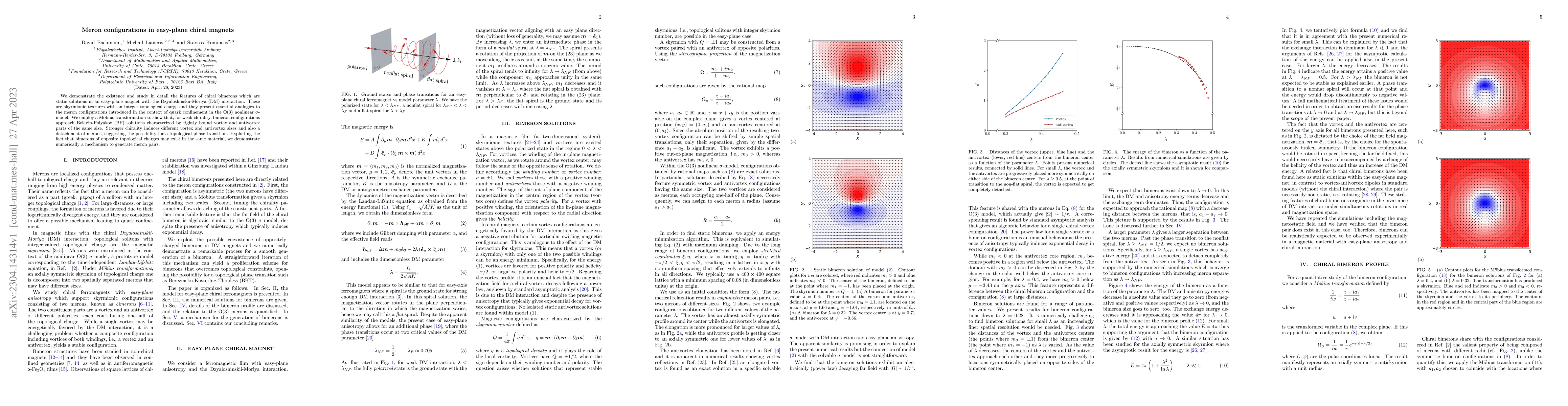 We demonstrate the existence and study in detail the features of chiral bimerons which are static solutions in an easy-plane magnet with the Dzyaloshinskii-Moriya (DM) interaction. These are skyrmionic textures with an integer topological charge and they present essential analogies to the meron configurations introduced in the context of quark confinement in the O(3) nonlinear sigma-model. We employ a Moebius transformation to show that, for weak chirality, bimeron configurations approach Belavin-Polyakov (BP) solutions characterized by tightly bound vortex and antivortex parts of the same size. Stronger chirality induces different vortex and antivortex sizes and also a detachment of merons, suggesting the possibility for a topological phase transition. Exploiting the fact that bimerons of opposite topological charges may exist in the same material, we demonstrate numerically a mechanism to generate meron pairs.