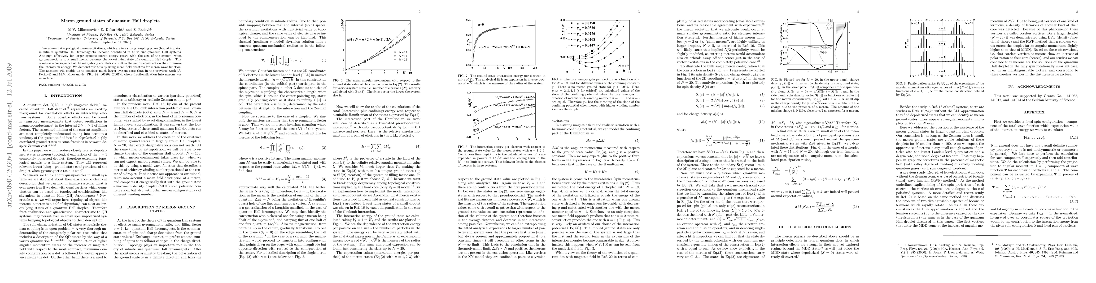 This paper argues that topological meron excitations, typically paired in infinite quantum Hall ferromagnets, become deconfined in finite systems and can be the lowest energy state in quantum Hall droplets when the gyromagnetic ratio is small. The authors use mean field ansatzes to demonstrate this behavior and consider larger system sizes than previous studies.