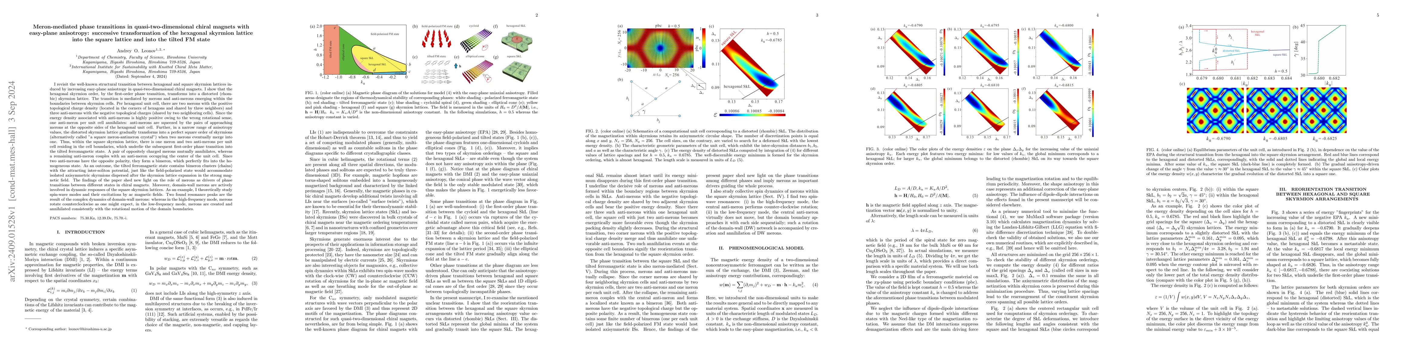 This paper explores phase transitions in quasi-two-dimensional chiral magnets with easy-plane anisotropy, showing how a hexagonal skyrmion lattice transforms through a meron-mediated process into a square lattice and eventually into a tilted ferromagnetic state, with dynamic responses analyzed via spin-wave modes.