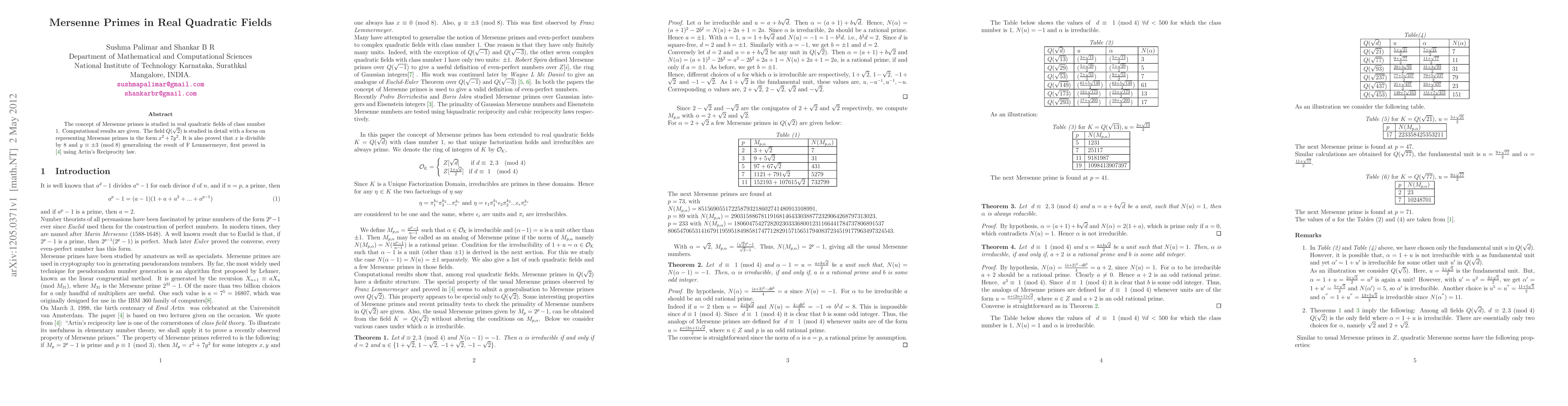 This paper investigates Mersenne primes within real quadratic fields of class number 1, specifically focusing on the field $Q(\sqrt{2})$. It proves that any Mersenne prime in this field can be represented as $x^{2}+7y^{2}$, and generalizes a result showing $x$ is divisible by 8 and $y\equiv \pm3\pmod{8}$.