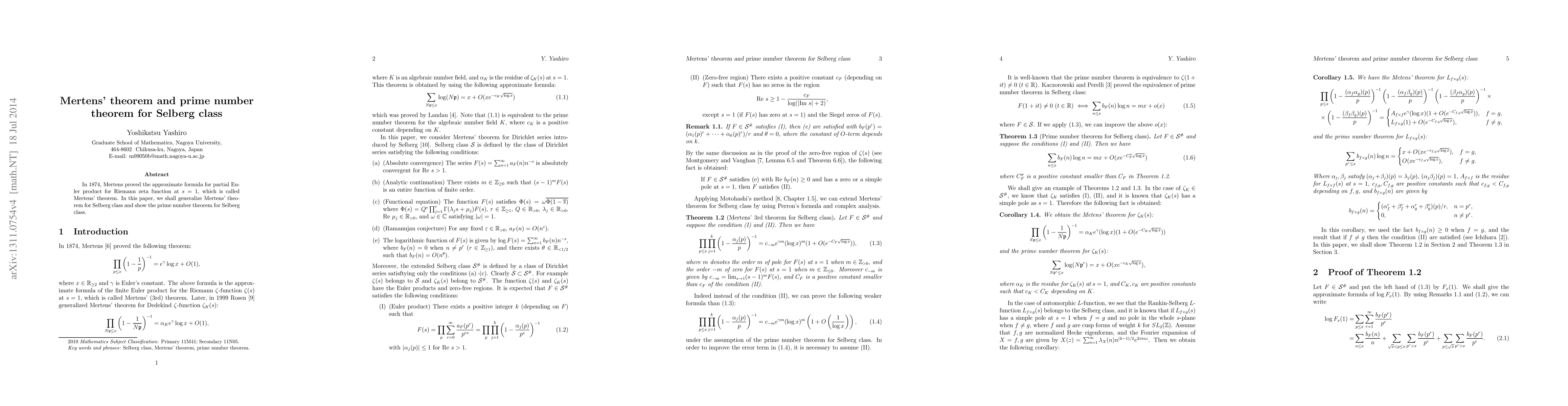Summary: This paper generalizes Mertens' theorem for the Selberg class and establishes the prime number theorem within this generalized framework, extending classical results about the distribution of prime numbers.