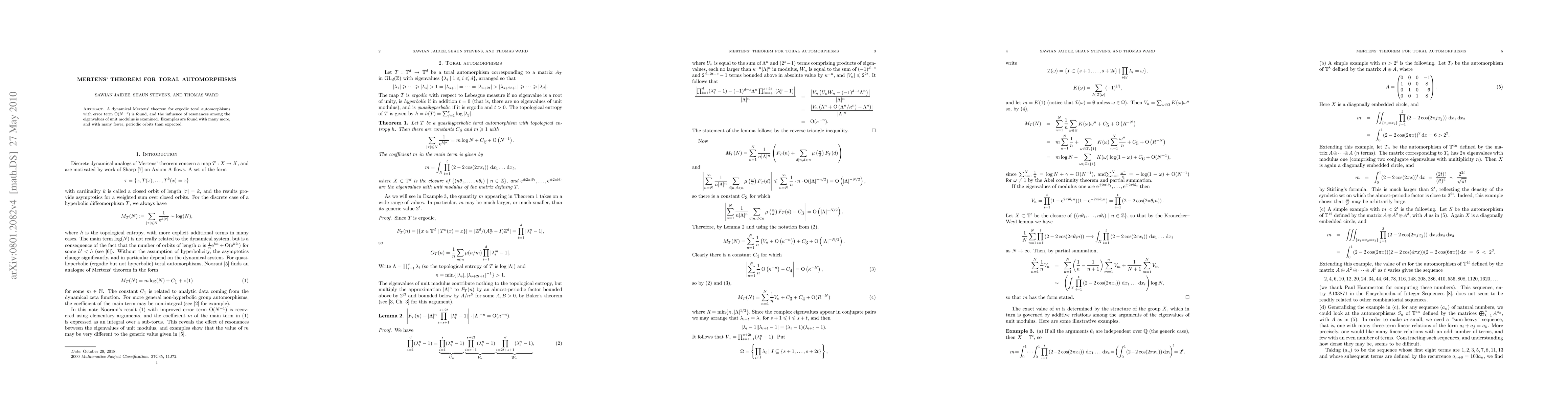 Summary: This paper establishes a dynamical Mertens' theorem for ergodic toral automorphisms with an error term of O(N^{-1}), exploring the impact of resonances among eigenvalues of unit modulus, and identifies examples with unexpected numbers of periodic orbits.