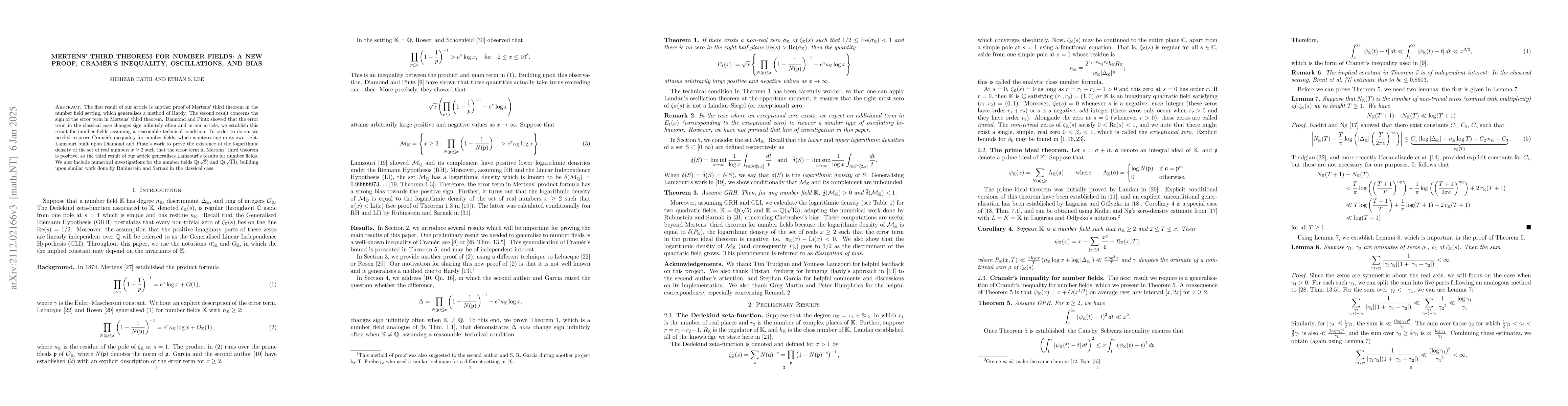 The first result of our article is another proof of Mertens' third theorem in the number field setting, which generalises a method of Hardy. The second result concerns the sign of the error term in Mertens' third theorem. Diamond and Pintz showed that the error term in the classical case changes sign infinitely often and in our article, we establish this result for number fields assuming a reasonable technical condition. In order to do so, we needed to prove Cram\'er's inequality for number fields, which is interesting in its own right. Lamzouri built upon Diamond and Pintz's work to prove the existence of the logarithmic density of the set of real numbers $x \ge 2$ such that the error term in Mertens' third theorem is positive, so the third result of our article generalises Lamzouri's results for number fields. We also include numerical investigations for the number fields $\mathbb{Q}(\sqrt{5})$ and $\mathbb{Q}(\sqrt{13})$, building upon similar work done by Rubinstein and Sarnak in the classical case.