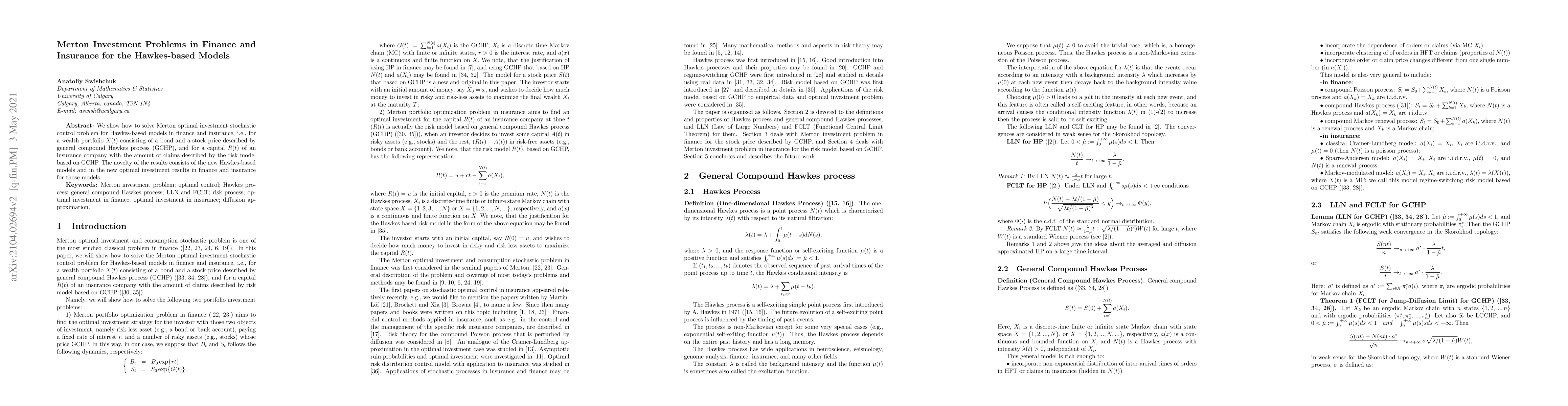 We show how to solve Merton optimal investment stochastic control problem for Hawkes-based models in finance and insurance, i.e., for a wealth portfolio X(t) consisting of a bond and a stock price described by general compound Hawkes process (GCHP), and for a capital R(t) of an insurance company with the amount of claims described by the risk model based on GCHP. The novelty of the results consists of the new Hawkes-based models and in the new optimal investment results in finance and insurance for those models.