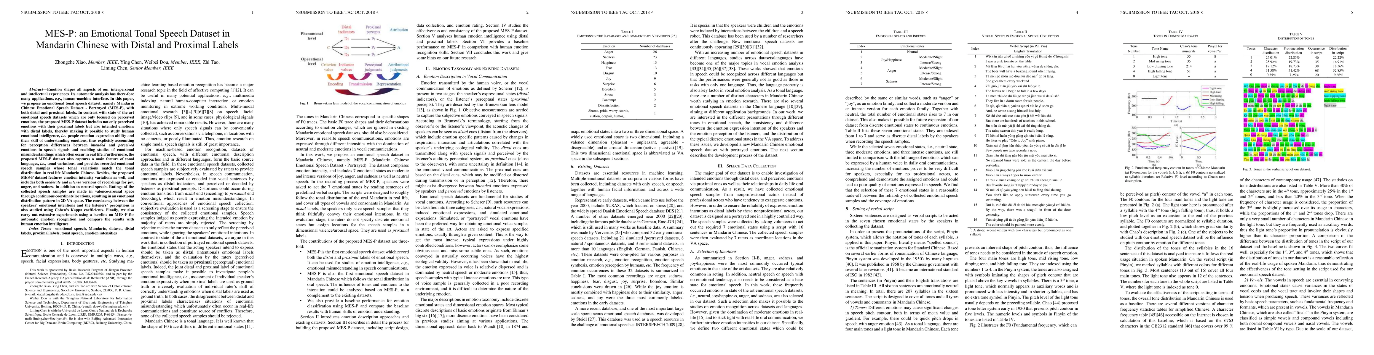 The MES-P dataset introduces an emotional tonal speech dataset in Mandarin Chinese with both distal and proximal labels, enabling studies on human emotional intelligence and emotional misunderstandings. It captures tonal variations and emotion intensity variations, and includes extensive experiments for automatic emotion recognition.