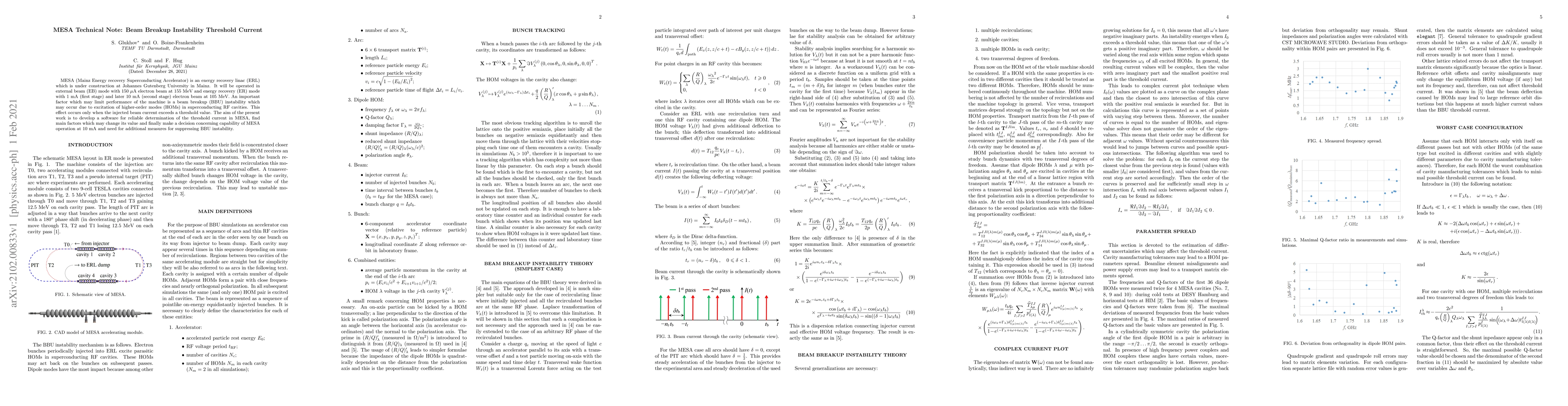 MESA (Mainz Energy recovery Superconducting Accelerator) is an energy recovery linac (ERL) which is under construction at Johannes Gutenberg University in Mainz. It will be operated in external beam (EB) mode with 150 $\mu$A electron beam at 155 MeV and energy recovery (ER) mode with 1 mA (first stage) and later 10 mA (second stage) electron beam at 105 MeV. An important factor which may limit performance of the machine is a beam breakup (BBU) instability which may occur due to excitation of higher-order modes (HOMs) in superconducting RF cavities. This effect occurs only when the injected beam current exceeds a threshold value. The aim of the present work is to develop a software for reliable determination of the threshold current in MESA, find main factors which may change its value and finally make a decision concerning capability of MESA operation at 10 mA and need for additional measures for suppressing BBU instability.