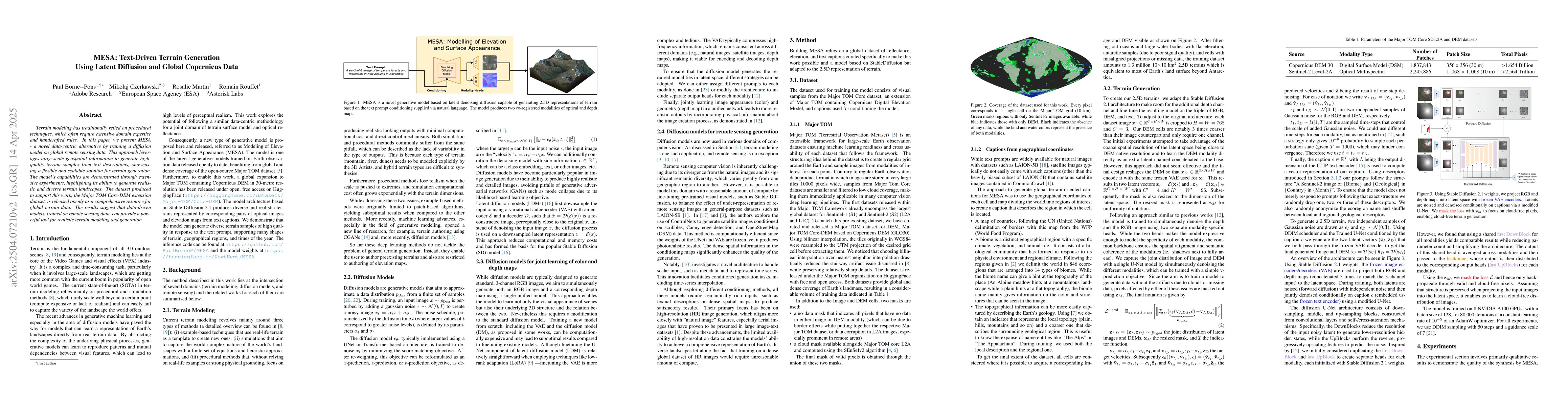 The research presents MESA, a text-driven diffusion model for terrain generation using global Copernicus data. It trains a diffusion model on a dataset comprising visual samples from MajorTOM Core dataset and Copernicus Digital Elevation Model (DEM), along with text captions for conditioning. The model adapts Stable Diffusion 2.1 architecture to accommodate an additional depth channel and fine-tunes the resulting model on RGB, DEM, and text triples.