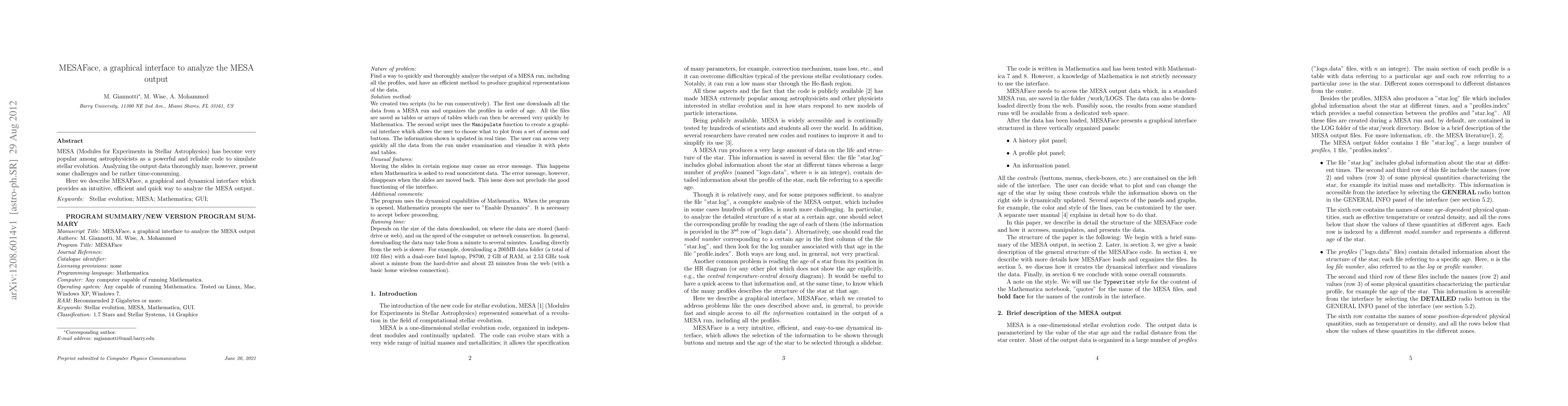 MESAFace is introduced as a user-friendly graphical interface designed to simplify the analysis of MESA (Modules for Experiments in Stellar Astrophysics) output data, making the process more efficient and less time-consuming for astrophysicists.