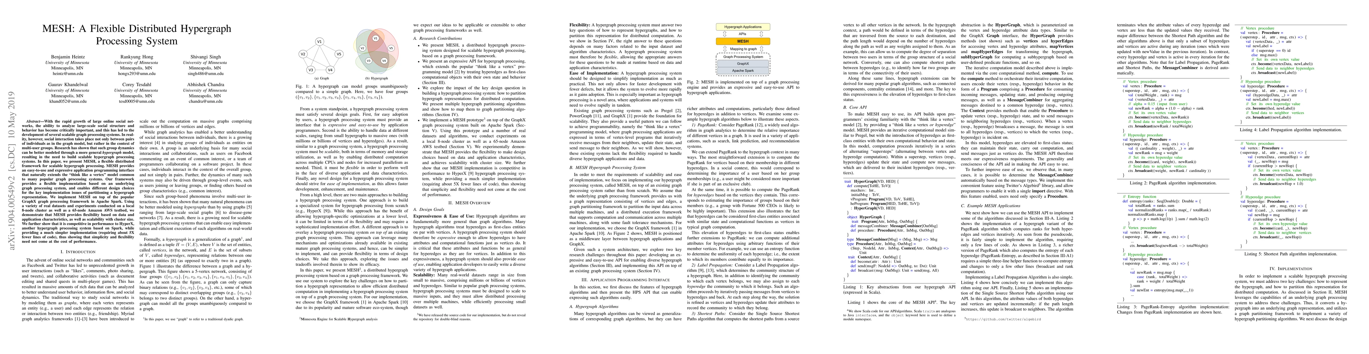 MESH is a flexible distributed framework for scalable hypergraph processing, implemented on top of Apache Spark's GraphX. It offers a simple API and competitive performance with minimal implementation effort compared to other systems.