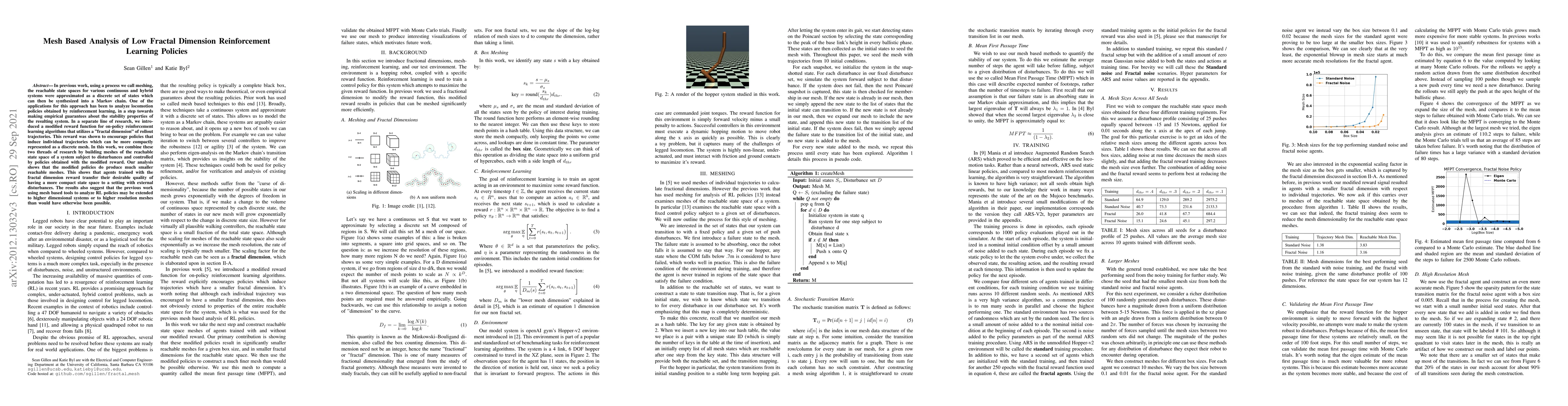 This paper combines mesh-based analysis and reinforcement learning with a fractal dimension reward to show that policies trained with the fractal dimension reward produce smaller reachable state meshes, indicating more compact state representations even under disturbances. The results suggest enhanced applicability of mesh-based tools for analyzing reinforcement learning policies in higher dimensional systems.