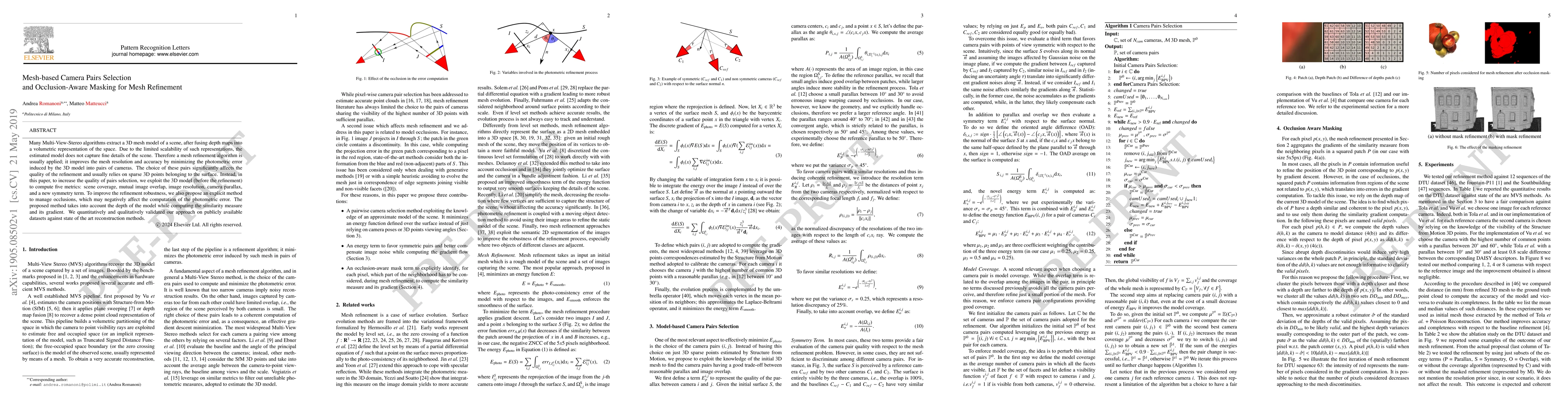 This paper proposes a mesh refinement method that selects optimal camera pairs based on five metrics: scene coverage, mutual image overlap, image resolution, camera parallax, and a new symmetry term. It also introduces occlusion-aware masking to improve refinement robustness, validated against state-of-the-art methods on public datasets.